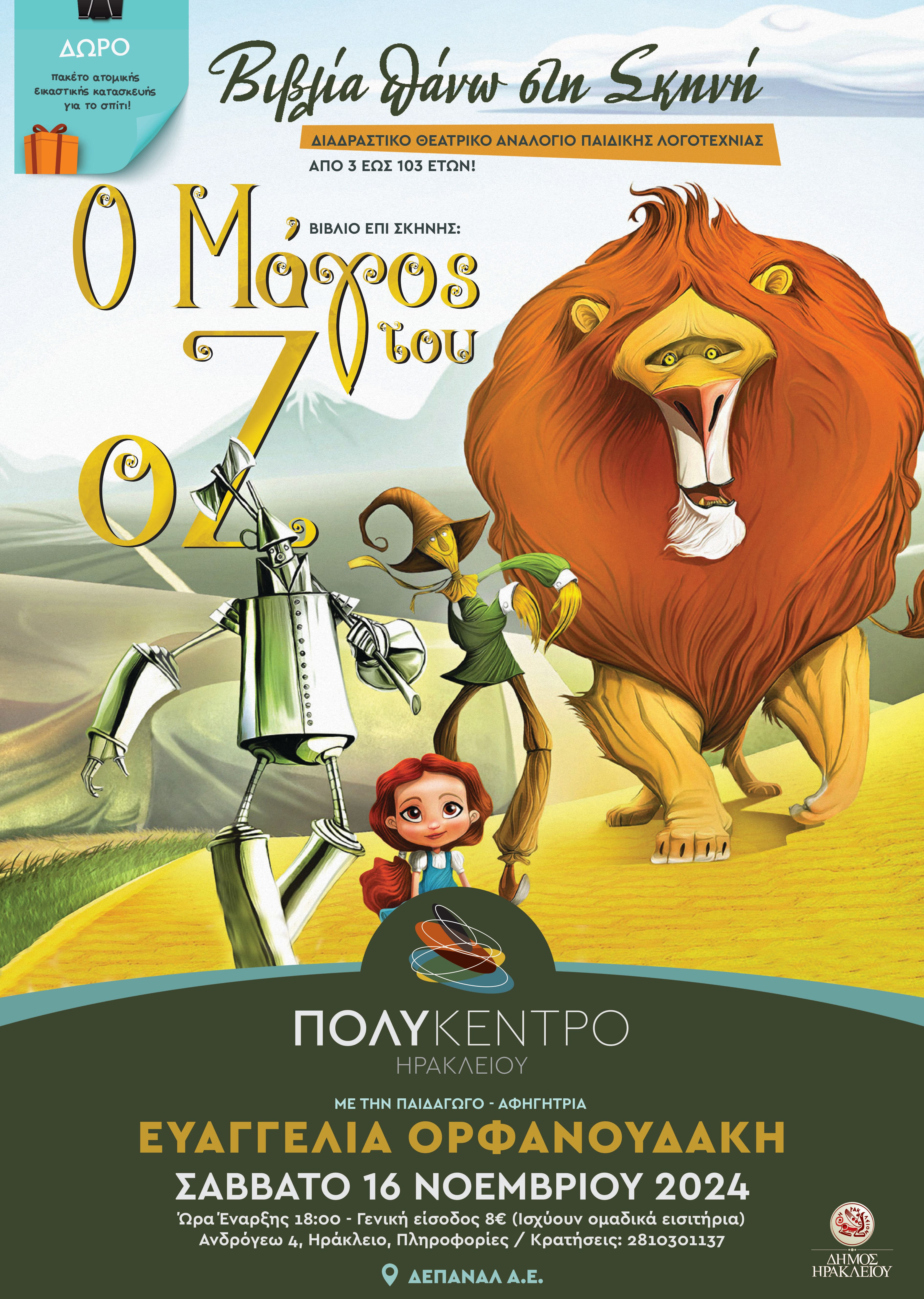 Δράση για όλη την Οικογένεια: «Βιβλία πάνω στη Σκηνή» – Διαδραστικό Θεατρικό Αναλόγιο παιδικής λογοτεχνίας με την Ευαγγελία Ορφανουδάκη. Βιβλία επί σκηνής το Σάββατο 16 Νοεμβρίου «Ο μάγος του Οζ», του Λύμαν Φρανκ Μπάουμ