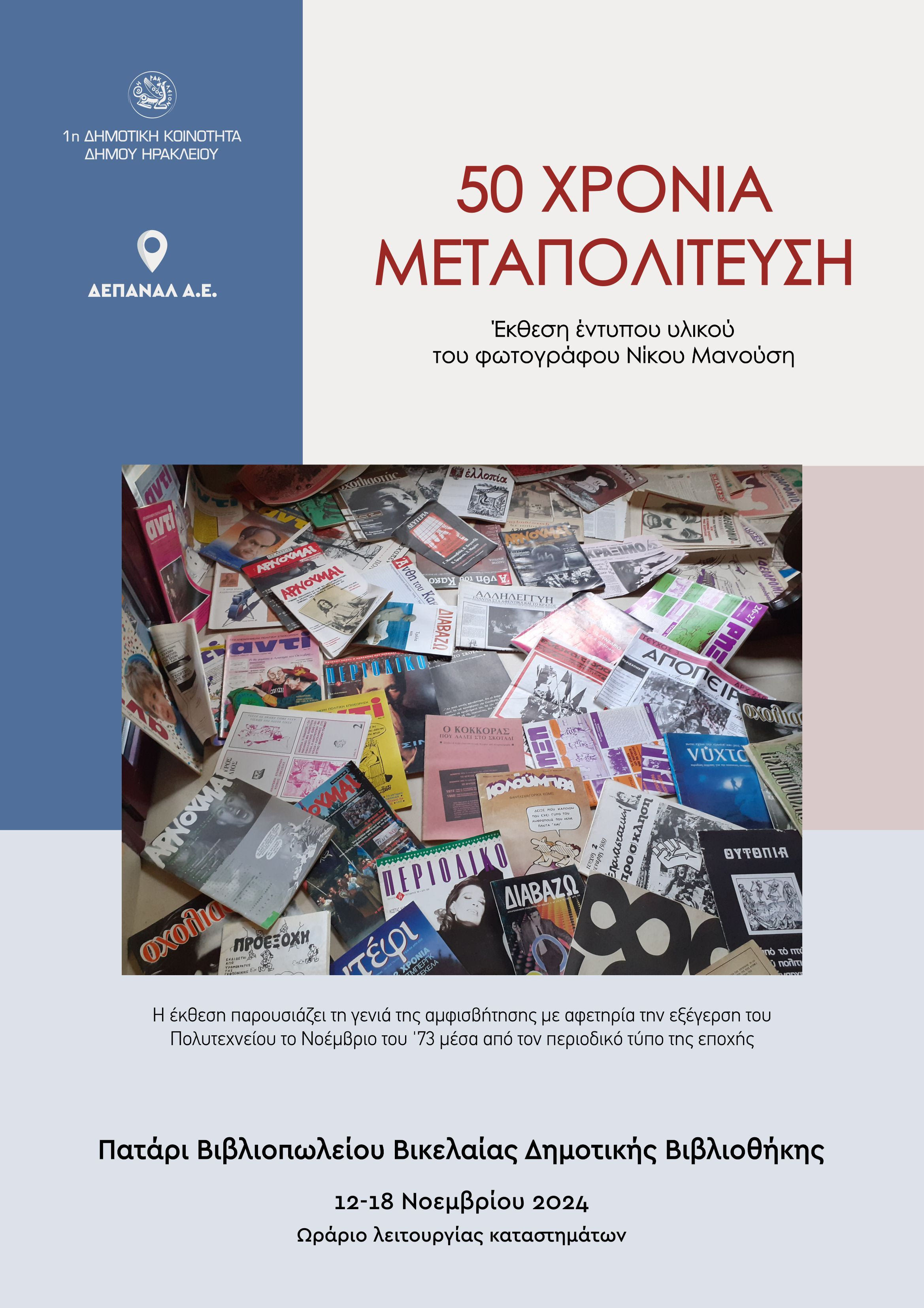 Η Πρώτη Κοινότητα του Δήμου Ηρακλείου και η ΔΕΠΑΝΑΛ ΑΕ διοργανώνουν έκθεση έντυπου υλικού του φωτογράφου Νίκου Μανούση με θέμα 50 ΧΡΟΝΙΑ ΑΝΤΙΠΟΛΙΤΕΥΣΗΣ, στο πατάρι του βιβλιοπωλείου της Βικελαίας Βιβλιοθήκης.