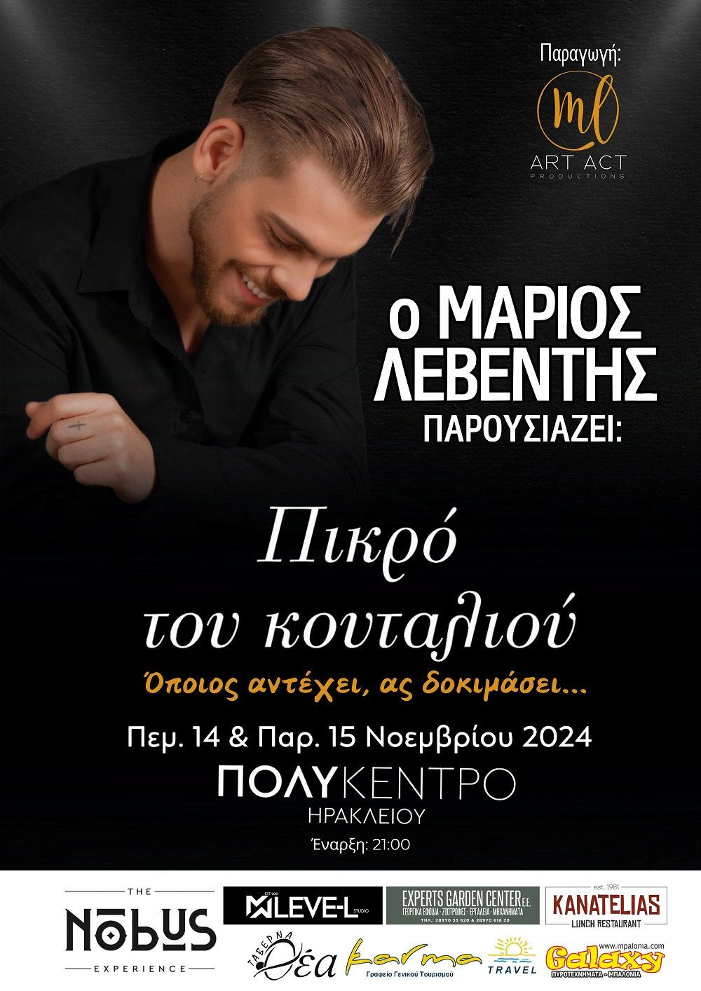 Το λογοτεχνικό θέαμα «Πικρό του κουταλιού», βασισμένο στο ομώνυμο βιβλίο του από τις Εκδόσεις Οδός Πανός θα παρουσιάσει ο Μάριος Λεβέντης στο ΠΟΛΥΚΕΝΤΡΟ του Δήμου Ηρακλείου, την Πέμπτη 14 και την