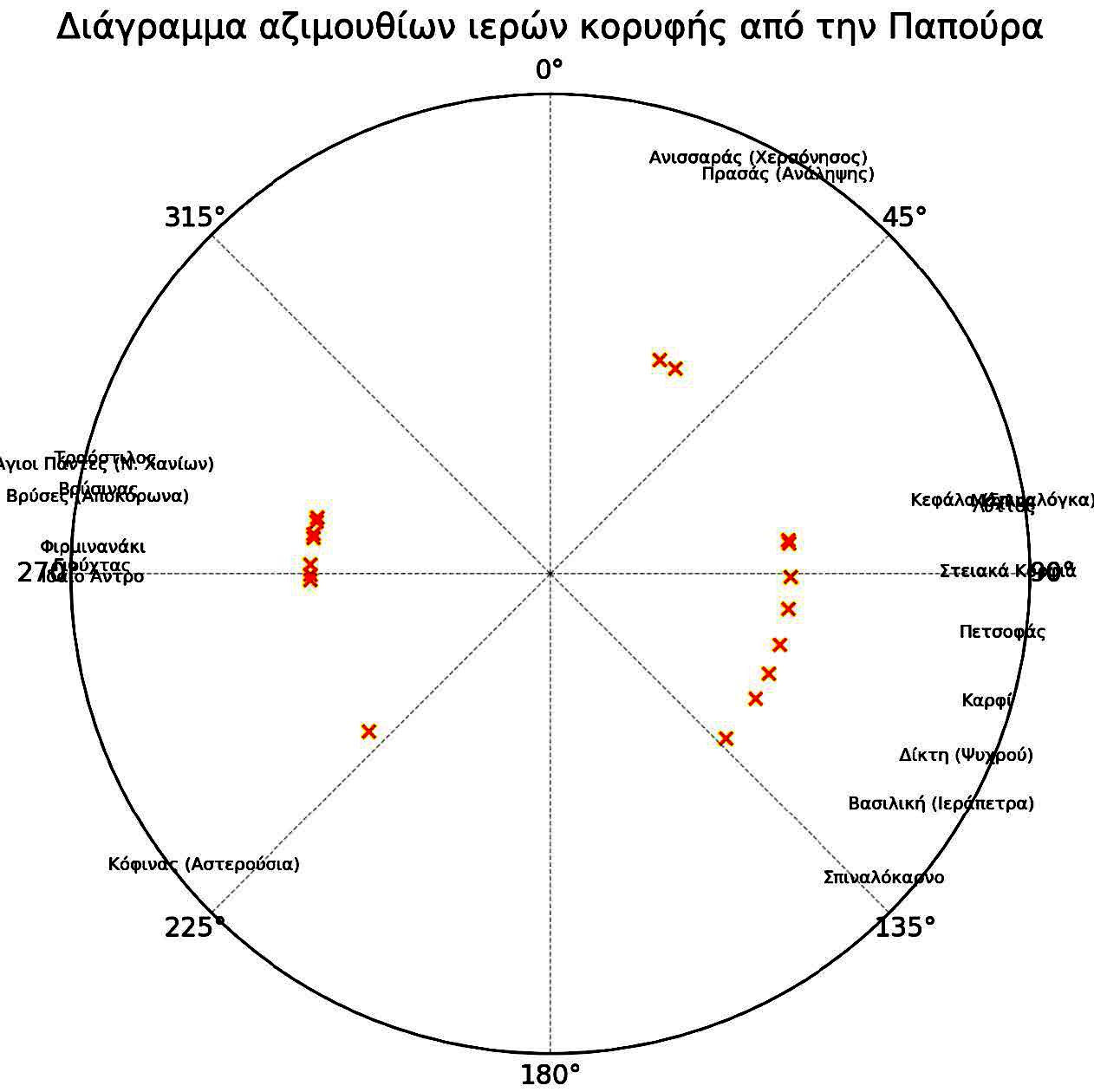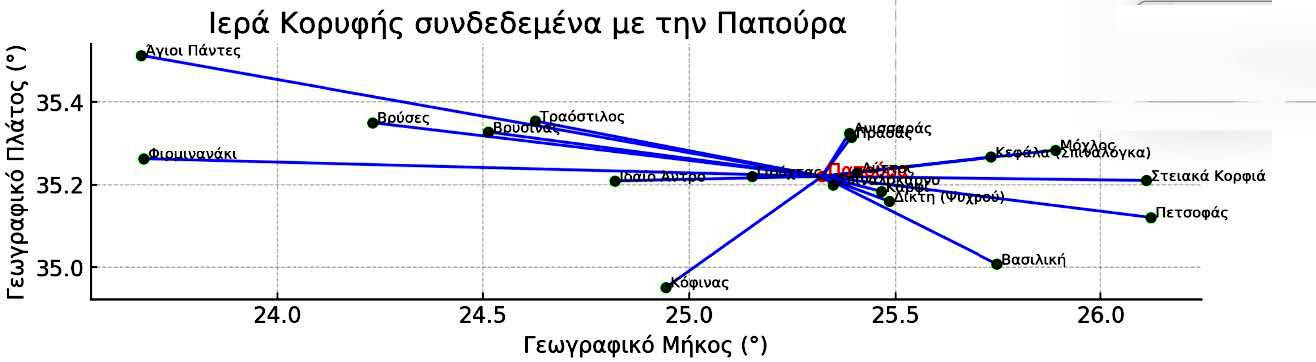 Ιερές κορυφές (Γιούχτας, Ιδαίο Άντρο, Δίκτη, Πετσοφάς) στοιχίζονται με αζιμούθια ισημεριών και ηλιοστασίων, καθιστώντας την Παπούρα παγκρήτιο κέντρο γεωγραφικής, αστρονομικής και πνευματικής συνάφειας.