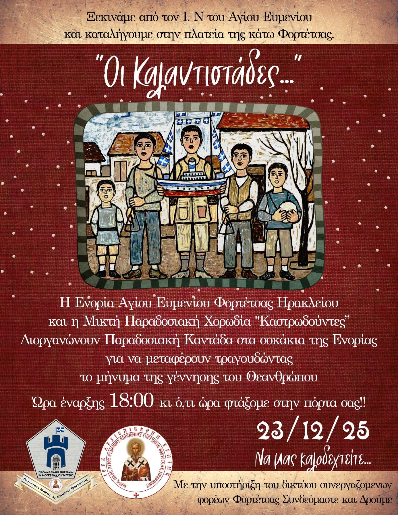 Η Ενορία Αγίου Ευμενίου Φορτέτσας Ηρακλείου, σε συνεργασία με τη Μικτή Παραδοσιακή Χορωδία «Καστρωδούντες», προσκαλεί τους κατοίκους και τους επισκέπτες της περιοχής σε μια ξεχωριστή παραδοσιακή καντάδα, γεμάτη ήχους, μνήμες και το βαθύ νόημα των Χριστουγέννων.