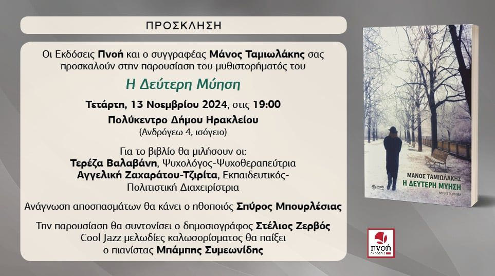 Παρουσίαση μυθιστορήματος «Η Δεύτερη Μύηση» του Μάνου Ταμιωλάκη θα πραγματοποιηθεί την Τετάρτη 13 Νοεμβρίου 2024, στις 19:00 το απόγευμα στο ΠΟΛΥΚΕΝΤΡΟ του Δήμου Ηρακλείου (Ανδρόγεω 4).