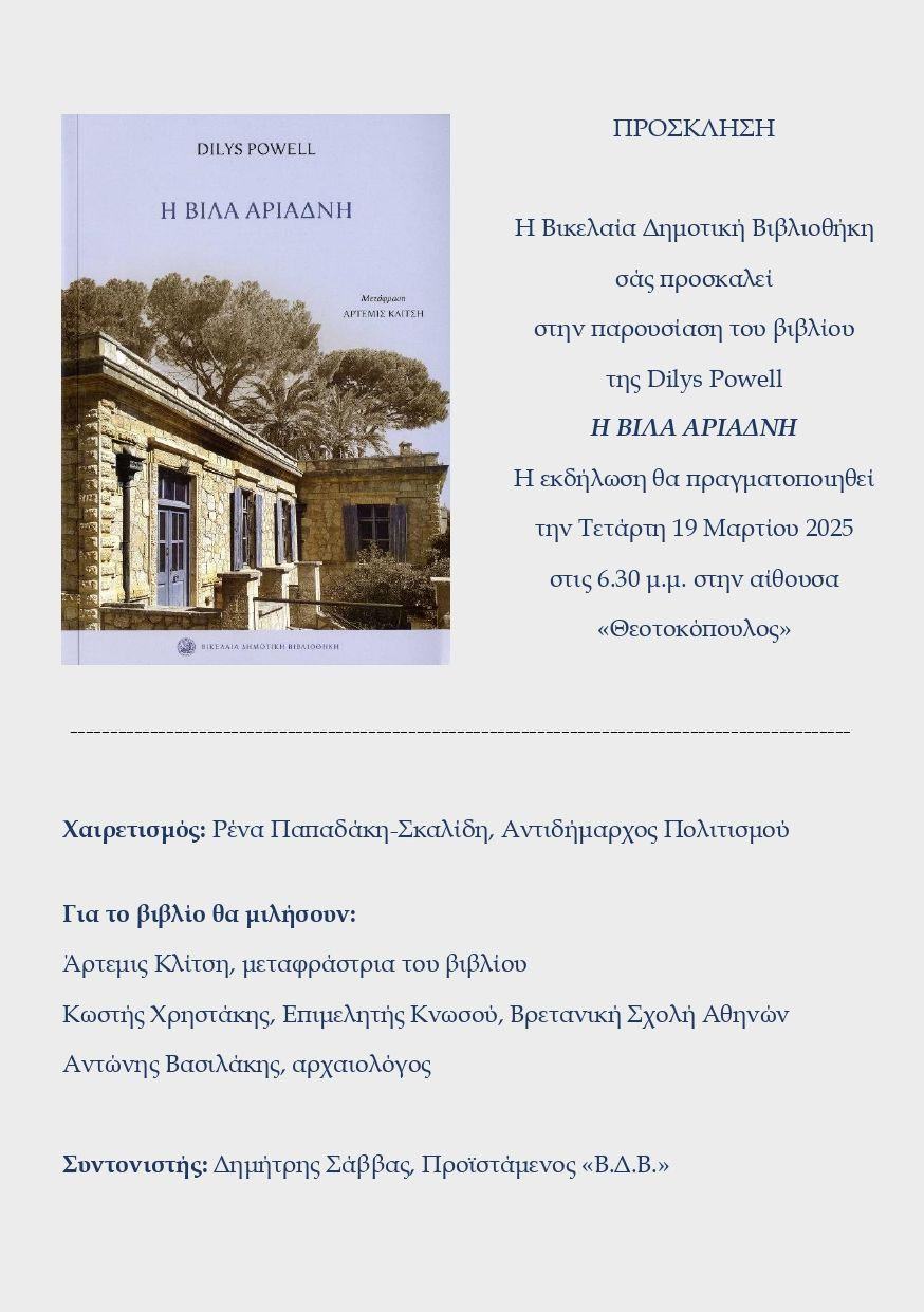 Η νέα έκδοση της Βικελαίας Δημοτικής Βιβλιοθήκης, το βιβλίο με τίτλο «Η Βίλλα Αριάδνη» της Dilys Powell, θα παρουσιαστεί την Τετάρτη 19 Μαρτίου στις 18:30 στην αίθουσα «Θεοτοκόπουλος» της Βιβλιοθήκης.