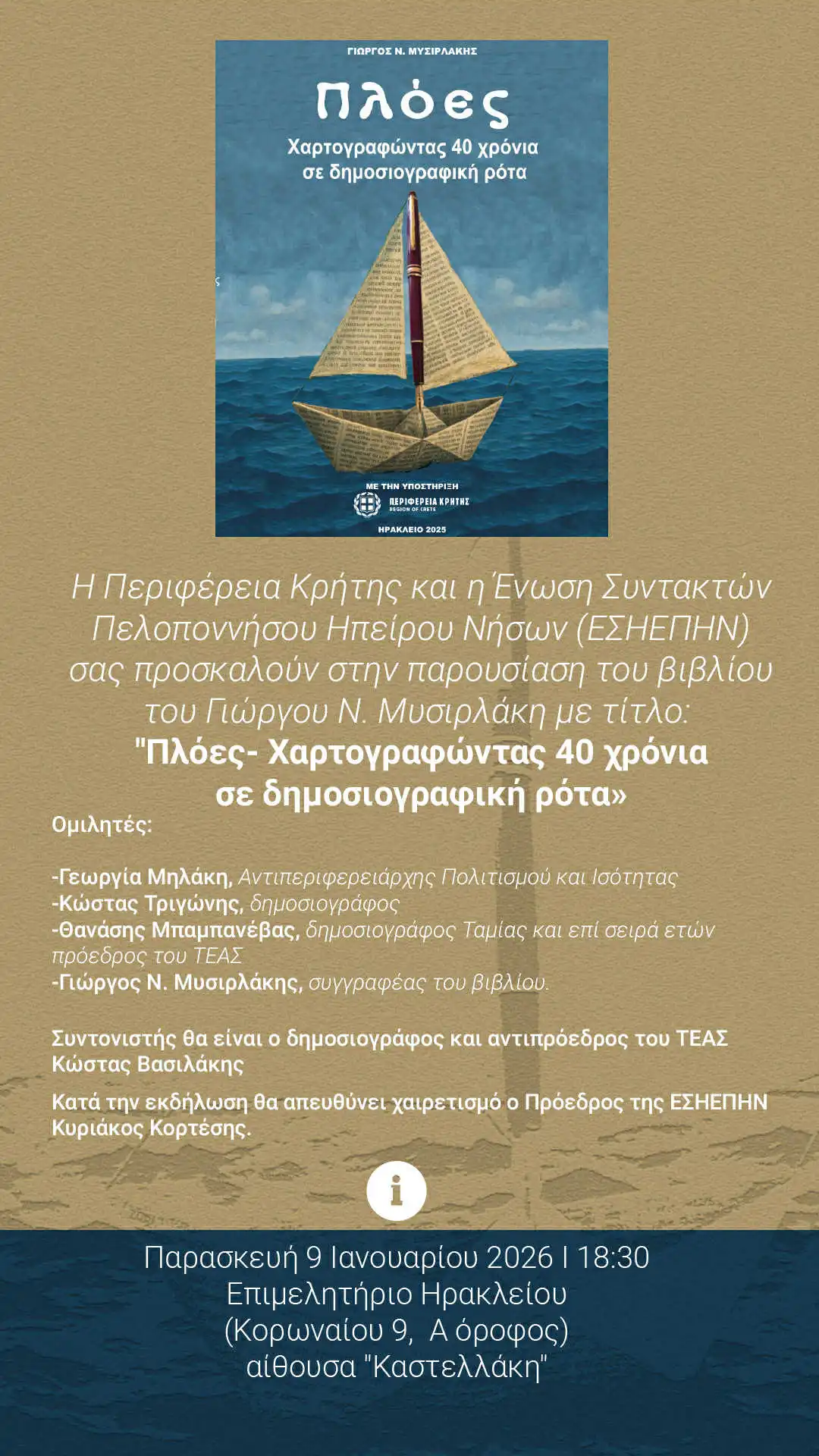 Σαράντα χρόνια δημοσιογραφικής διαδρομής, εμπειριών, αναζητήσεων και καταγραφής της εποχής, συμπυκνώνονται στο βιβλίο του δημοσιογράφου Γιώργου Ν. Μυσιρλάκη με τίτλο «Πλόες – Χαρτογραφώντας 40 χρόνια σε δημοσιογραφική ρότα», το οποίο παρουσιάζουν η Περιφέρεια Κρήτης και η Ένωση Συντακτών Πελοποννήσου, Ηπείρου Νήσων (ΕΣΗΕΠΗΝ).