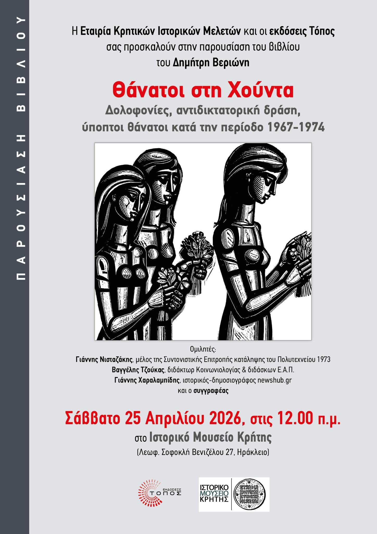 Η παρουσίαση του βιβλίου του Δημήτρη Βεριώνη, «Θάνατοι στη Χούντα. Δολοφονίες, αντιδικτατορική δράση, ύποπτοι θάνατοι κατά την περίοδο 1967-1974», Εκδόσεις Τόπος, Αθήνα 2024, θα γίνει το Σάββατο 25 Απριλίου 2026, στις 12:00΄, στο Αμφιθέατρο Γιάννη Περτσελάκη του Ιστορικού Μουσείου Κρήτης (Λεωφ. Σοφοκλή Βενιζέλου 27, Ηράκλειο) .