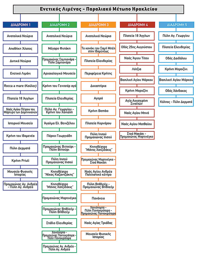 Η πρώτη διαδρομή θα καλύπτει την παραλιακή ζώνη και συγκεκριμένα από το ενετικό λιμάνι έως τον προμαχώνα του Αγίου Ανδρέα. Η δεύτερη διαδρομή θα καλύπτει όλη την πορεία των ενετικών τειχών. Η τρίτη διαδρομή θα είναι διαμορφωμένη, με τρόπο ώστε ο επισκέπτης να μπορεί να γνωρίσει τις ενετικές πύλες. Συγκεκριμένα θα έχει ως αφετηρία την πύλη Δερματά, τη Χανιώπορτα, την πύλη Παντοκράτορα, την πλατεία Κορνάρου, την κεντρική αγορά, τη Δικαιοσύνης και θα καταλήγει στο λιμάνι. Η τέταρτη διαδρομή θα συνδέει το ενετικό λιμάνι με το Πολιτιστικό Κέντρο και τέλος η πέμπτη διαδρομή θα αναπτύσσεται από τον κόλπο του Δερματά, προς την πλατεία Ελευθερίας. Ο κ. Αναστασάκης εξηγεί ότι μέσα από τη χάραξη αυτού του δικτύου των πολιτιστικών διαδρομών, ο πρώτος στόχος που επιτυγχάνεται είναι η ανάδειξη της ταυτότητας της παλιάς πόλης του Ηρακλείου, όπως και η προβολή των ιδιαίτερων ιστορικών και πολιτιστικών χαρακτηριστικών της. Αναδεικνύεται το ιστορικό κέντρο ως τουριστικός προορισμός και μέσα από τη διαδικασία αυτή προβάλλεται ο ενιαίος χαρακτήρας της παλιάς πόλης. Στις διαδρομές αυτές θα υπάρξει ένα ενιαίο σύστημα σήμανσης και πληροφόρησης το οποίο θα διαρθρώνεται σε θεματικά επίπεδα, και θα περιέχει τις απαραίτητες πληροφορίες ώστε να είναι αποτελεσματικό στη χρήση του από τον επισκέπτη της πόλης.