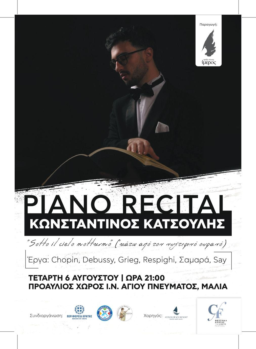 Ένα δεξιοτεχνικό και λυρικό ρεσιτάλ πιάνου κάτω από τον νυχτερινό ουρανό (sotto il cielo notturno) θα παρουσιάσει ο νεαρός και καταξιωμένος πιανίστας Κωνσταντίνος Κατσούλης, με καταγωγή από τα Μάλια Ηρακλείου Κρήτης.