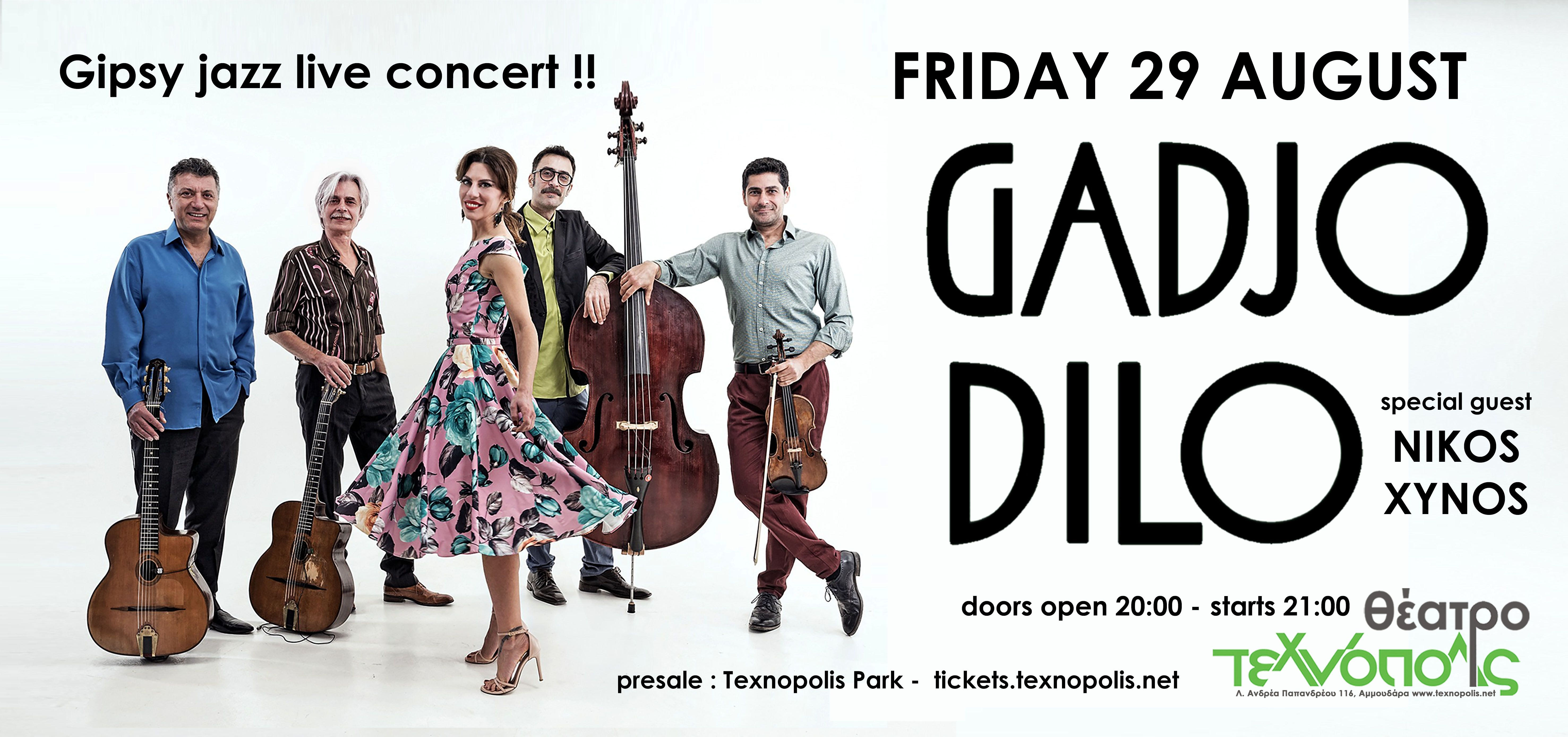 Οι Gadjo Dilo, η μπάντα που έχει γίνει συνώνυμο των ξεσηκωτικών live, με τη ξεχωριστή gypsy jazz μουσική τους, μας καλούν σε βραδιές βγαλμένες από άλλη εποχή, γεμάτες ρυθμό, τραγούδι και χορό την Παρασκευή 29 Αυγούστου στο Θέατρο Τεχνόπολις!