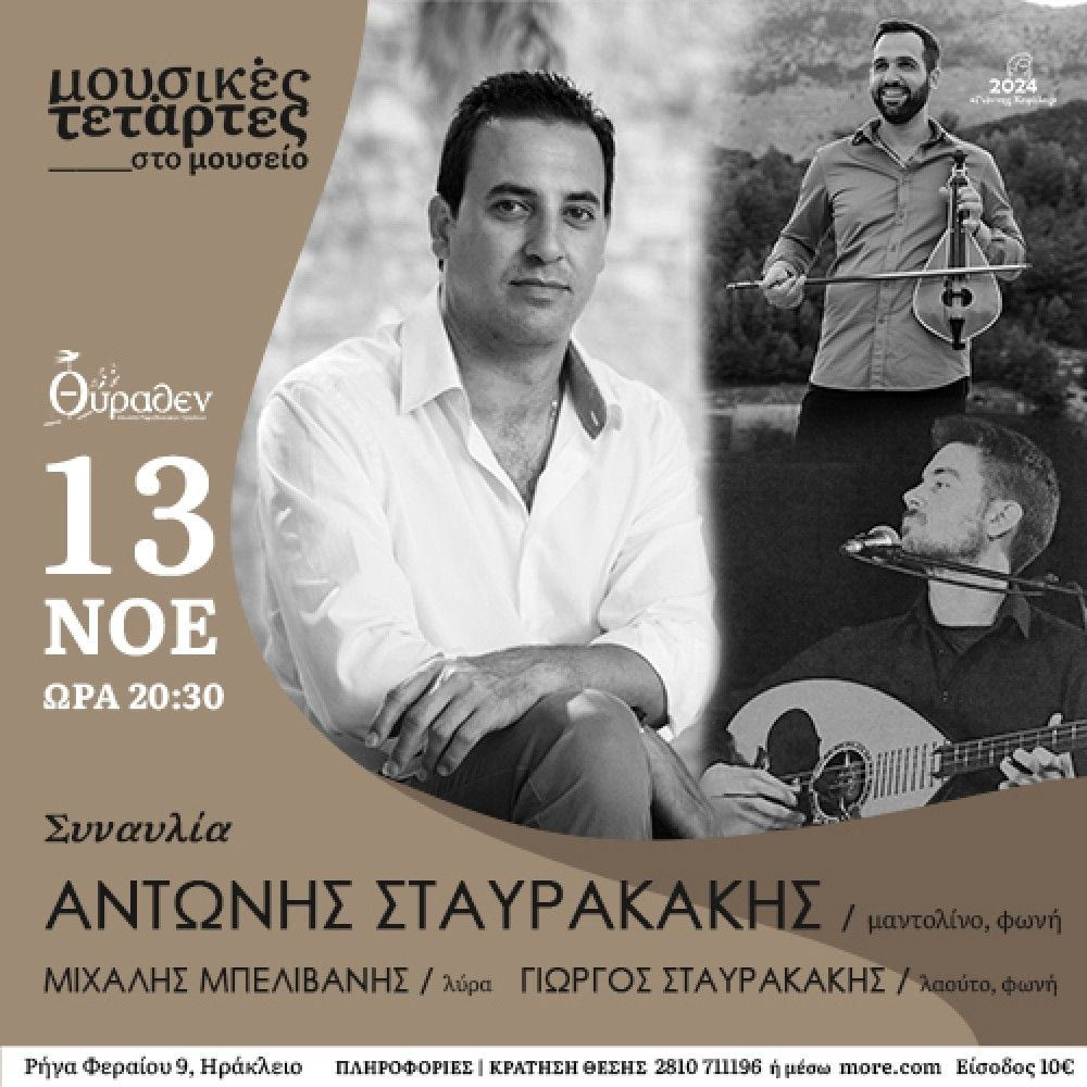 Τρεις νέοι ταλαντούχοι Μουσικοί με κοινές μουσικές καταβολές ο Αντώνης Σταυρακάκης μαζί με τους Μιχάλη Μπελιβάνη και τον Γιώργο Σταυρακάκη θα μας ταξιδέψουν μουσικά για μία ακόμη Τετάρτη στις 13 Νοεμβρίου στις 20:30 από άκρη σ’ ακρη στην Κρήτη.