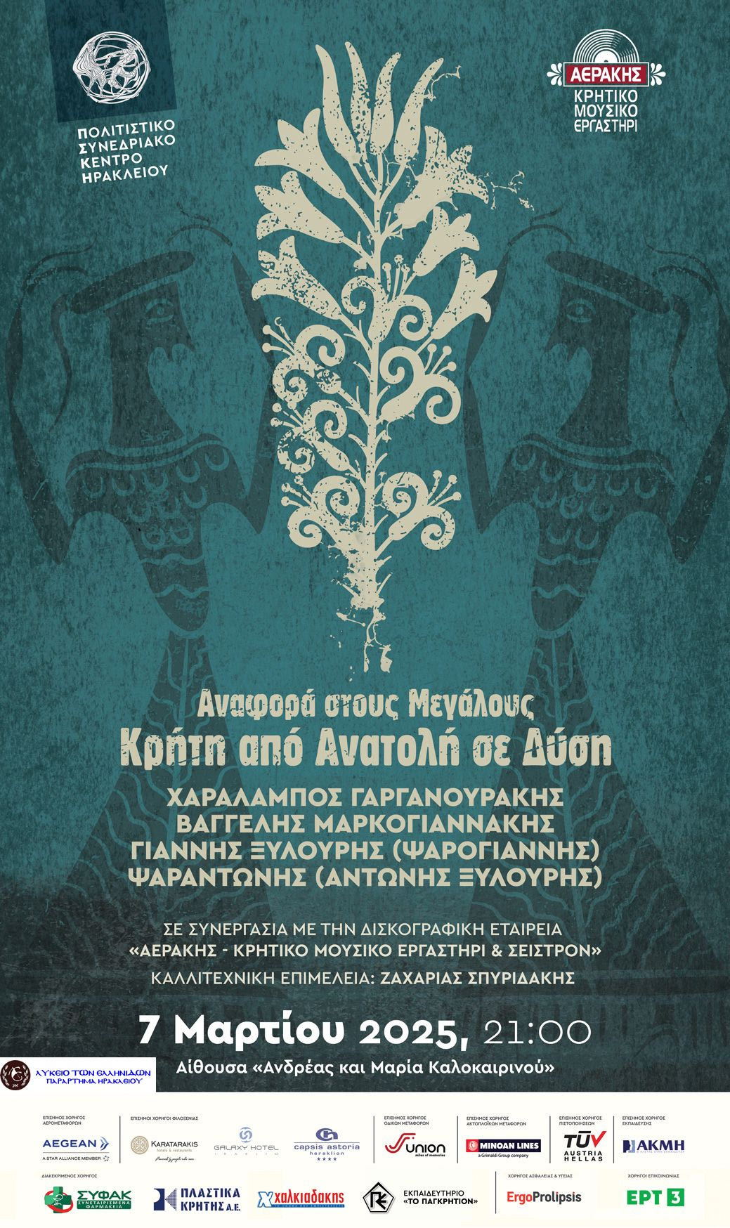 Σε συνεργασία με την εταιρεία Αεράκης-Κρητικό Μουσικό Εργαστήρι & Σείστρον, το Πολιτιστικό Συνεδριακό Κέντρο Ηρακλείου παρουσιάζει μια συναυλία αφιερωμένη σε τέσσερις σπουδαίους μεγάλους καλλιτέχνες της κρητικής μουσικής παράδοσης: τον Χαράλαμπο Γαργανουράκη, τον Βαγγέλη Μαρκογιαννάκη, τον Γιάννη Ξυλούρη (Ψαρογιάννη) και τον Ψαραντώνη (Αντώνη Ξυλούρη).