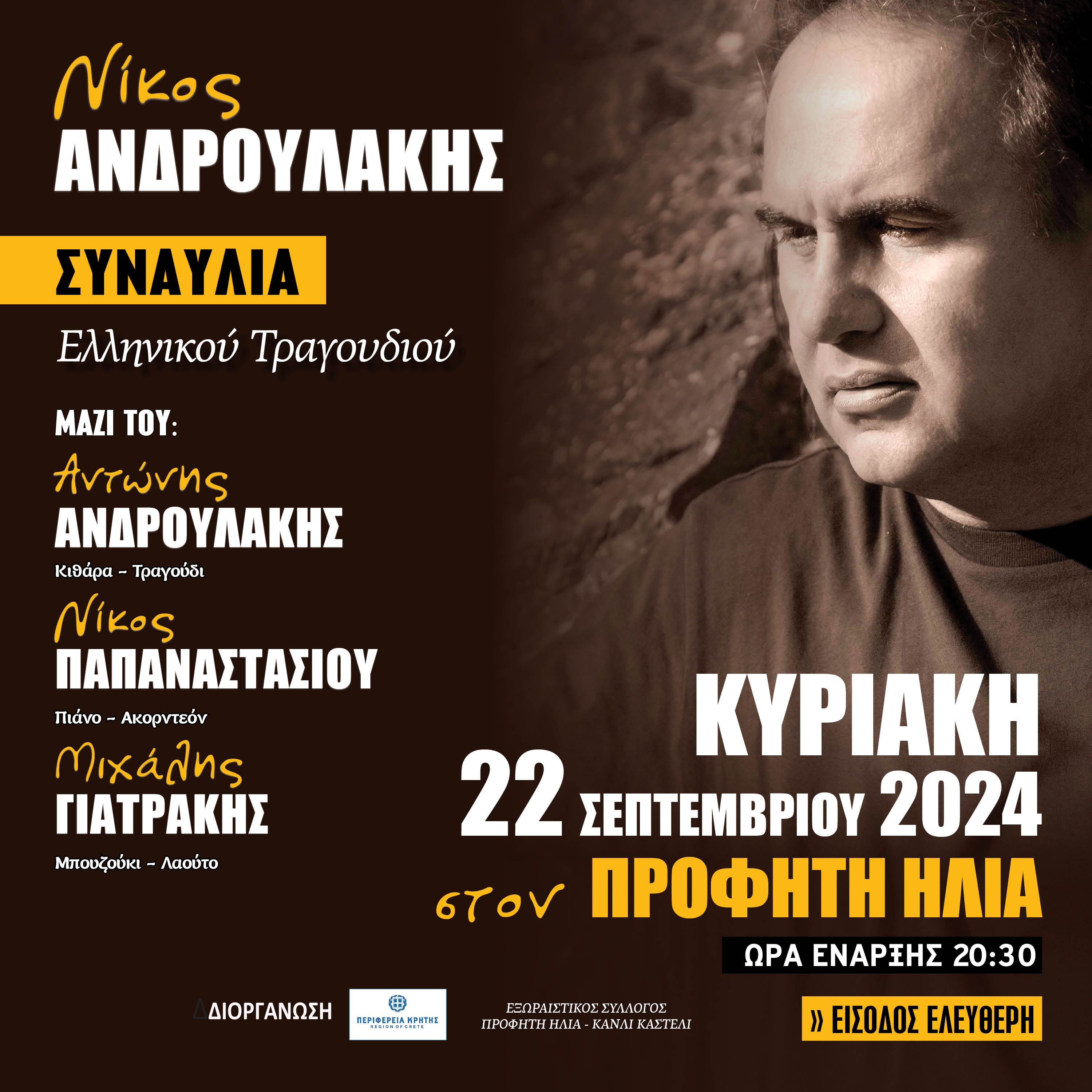 Δύο συναυλίες Ελληνικού τραγουδιού θα δώσει ο Νίκος Ανδρουλάκης, το Σάββατο 21 Σεπτεμβρίου 2024 ώρα 20.30, στις Αρχάνες – Δημοτικός Θερινός Κινηματογράφος και την Κυριακή 22 Σεπτεμβρίου 2024 ώρα 20.30, στον Προφήτη Ηλία με ελεύθερη είσοδο για τους πολίτες.