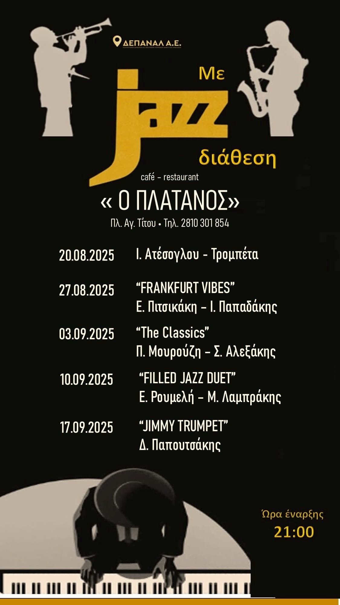 Συνεχίζονται οι μουσικές βραδιές «με jazz διάθεση» στο Café – Restaurant «Πλάτανος», στην Πλατεία του Αγίου Τίτου, με τη διοργάνωση της ΔΕΠΑΝΑΛ Α.Ε.