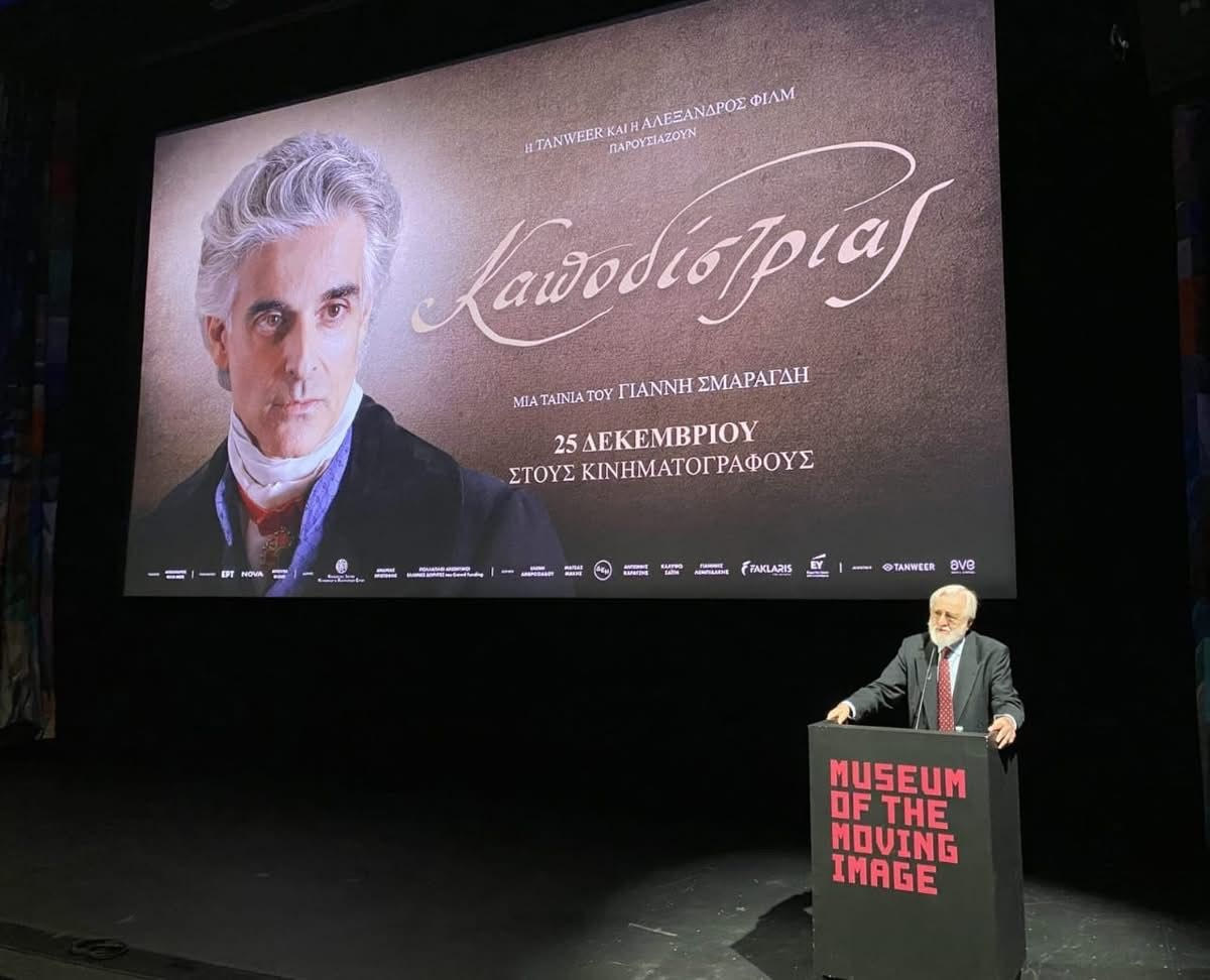 Η παγκόσμια πρεμιέρα της ταινίας «Καποδίστριας» του Γιάννη Σμαραγδή πραγματοποιήθηκε το Σάββατο 29 Νοεμβρίου στην αίθουσα προβολών του Museum of the Moving Image στη Νέα Υόρκη, παρουσία του σκηνοθέτη, της Ναταλίας Καποδίστρια, απογόνου του Ιωάννη Καποδίστρια, και του Μίνωος Μάτσα, που επιμελήθηκε τη μουσική της ταινίας.