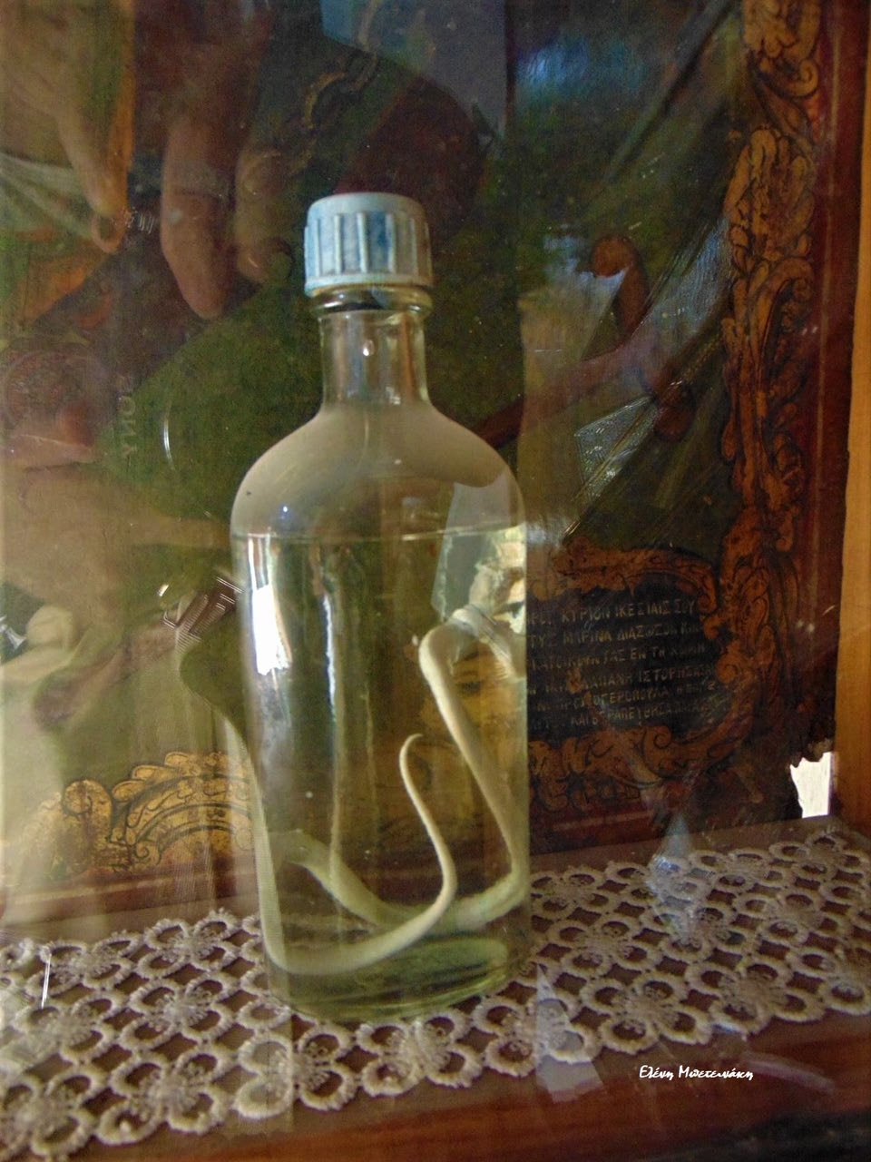 Την ιστορία της τσιγγάνας που έφτασε στην εκκλησία με φοβερούς πόνους στην κοιλιά και σαν προσευχήθηκε μπροστά στην εικόνα της Αγίας, μέσα από την κοιλιά της έφυγε τούτο το μικρό ερπετό κι όλοι μίλησαν για θαύμα αφού εκείνη έγινε καλά… Ταριχεύθηκε το φίδι κι έμεινε εκεί, να θυμίζει, να αφυπνίζει μυαλό-ψυχή και σώμα, ίσως!
