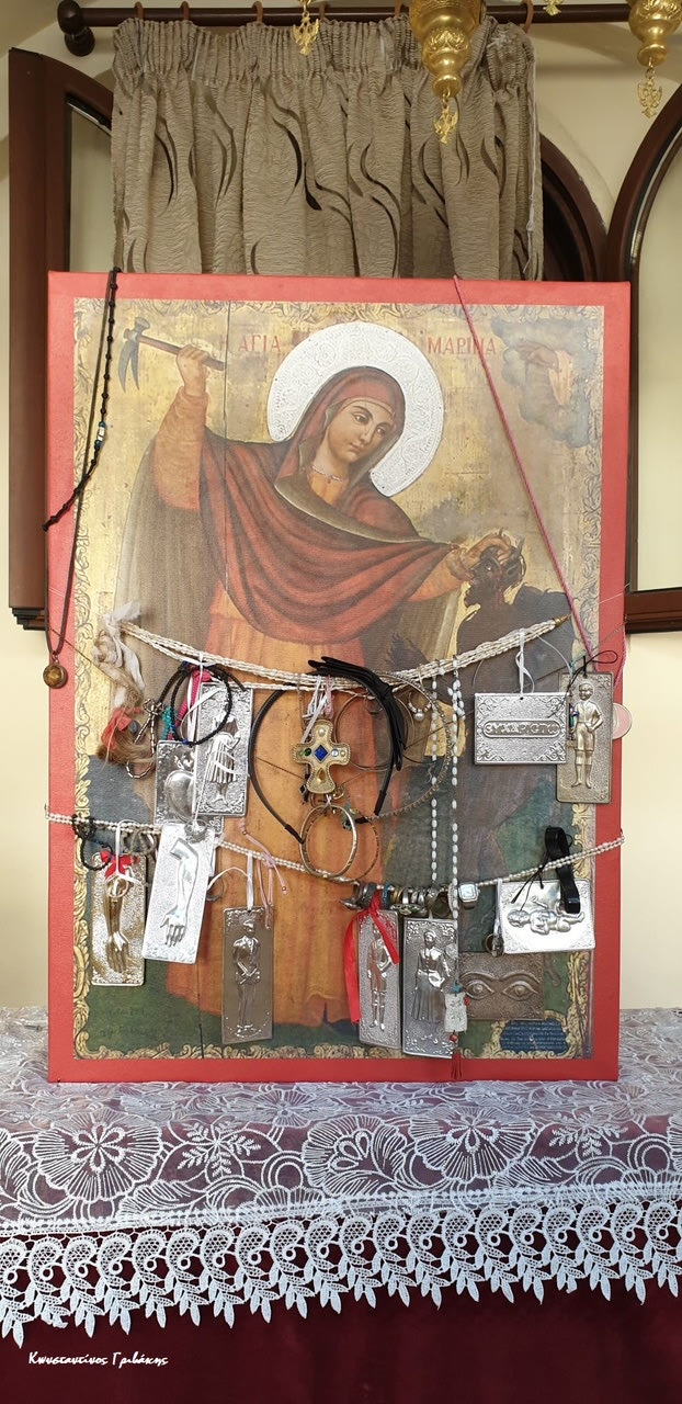 Βιαζόμασταν να φτάσουμε να ανάψουμε εκείνο το κερί στη χάρη Της, να δούμε όλα εκείνα τα παράξενα που είχαμε ακούσει. Λέγανε πως όταν έταζαν ένα παιδί στην Αγία Μαρίνα, που ήταν λίγο καχεκτικό και αρρωστιάρικο, για να γίνει καλά το έντυναν με μαύρα ρούχα για σαράντα μέρες κι ύστερα τα άφηναν στο μοναστήρι κρεμασμένα στην εικόνα της, για τους φτωχούς.