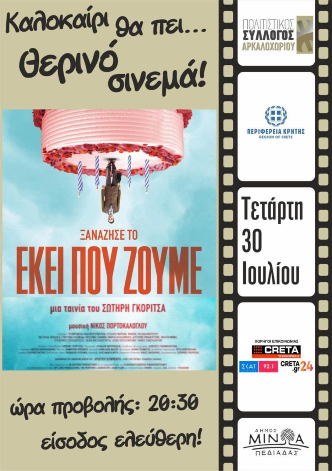 Κάθε Τετάρτη, το Αρκαλοχώρι μετατρέπεται σε θερινό σινεμά, προσκαλώντας το κοινό σε βραδιές κινηματογράφου με ελεύθερη είσοδο και καλοκαιρινή ατμόσφαιρα.
