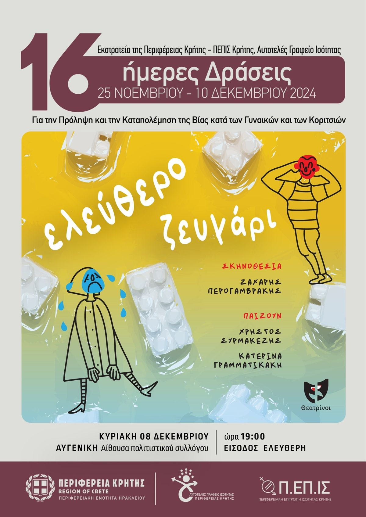Στο πλαίσιο των «16ήμερων Δράσεων της Περιφέρειας Κρήτης για την Πρόληψη και την Καταπολέμηση της Βίας κατά των Γυναικών και των Κοριτσιών» παρουσιάζεται η θεατρική παράσταση «Ελεύθερο Ζευγάρι», από την Ομάδα Θεάτρου «Θεατρίνοι», την Κυριακή 8 Δεκεμβρίου 2024 και ώρα 7:00μ.μ., στην Αίθουσα του Πολιτιστικού Συλλόγου Αυγενικής.