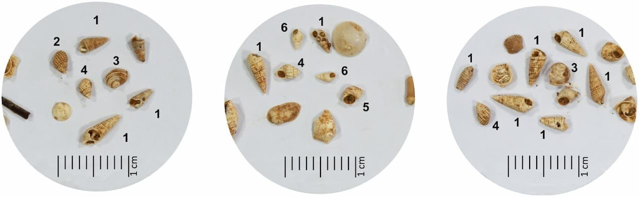 Τα δείγματα αυτά κοσκινίστηκαν προσεκτικά, μέσα από επίπλευση, μια τεχνική που διαχωρίζει τα ελαφρά σωματίδια, όπως είναι τα κελύφη των μαλακίων.