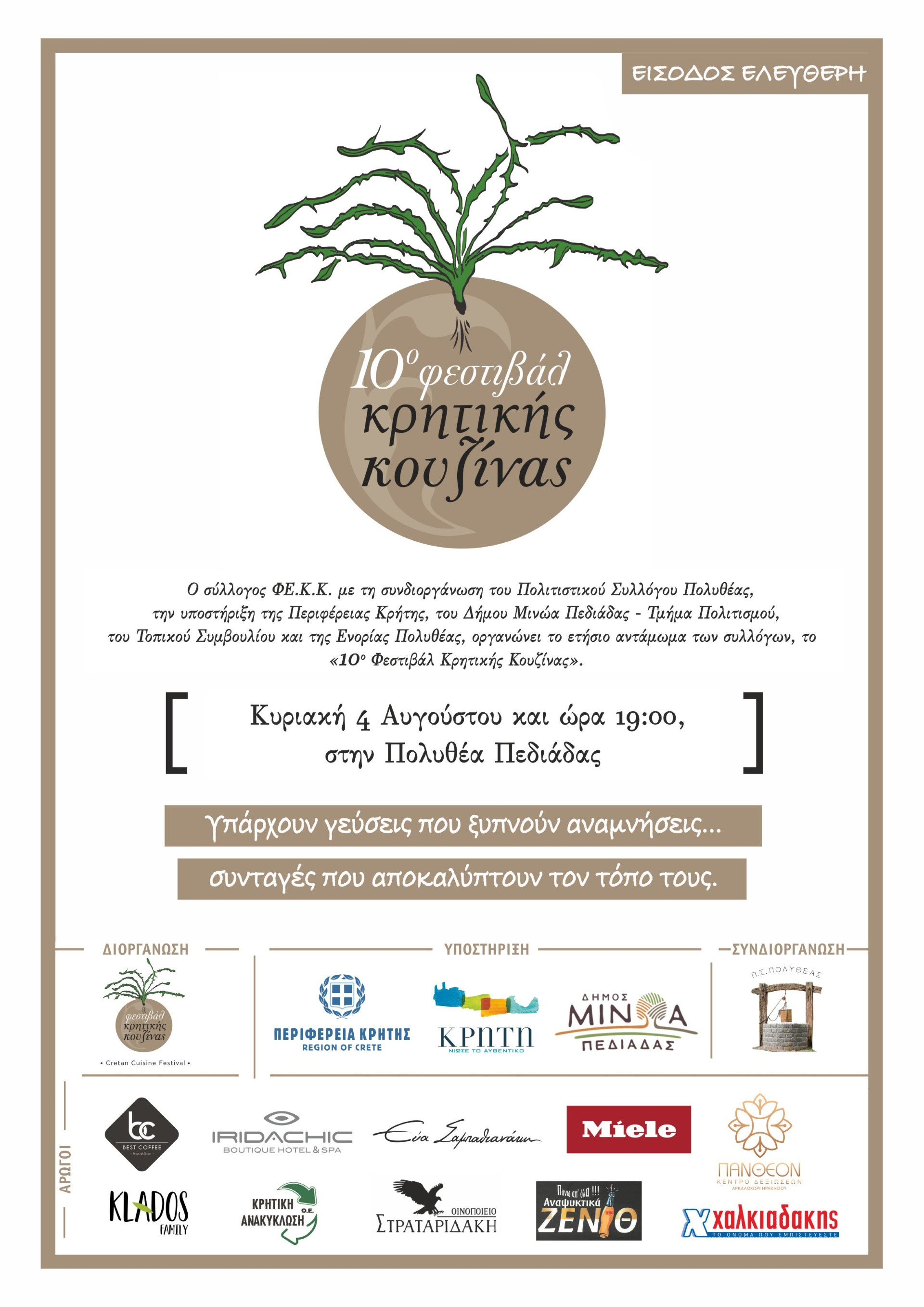 Ο Σύλλογος Φεστιβάλ Κρητικής Κουζίνας με τη συνδιοργάνωση του Πολιτιστικού Συλλόγου Πολυθέας, την υποστήριξη της Περιφέρειας Κρήτης, του Δήμου Μινώα Πεδιάδας, του Τοπικού Συμβουλίου και της Ενορίας Πολυθέας προσκαλούν το κοινό στο 10ο Φεστιβάλ Κρητικής Κουζίνας, την Κυριακή 4 Αυγούστου, στις 7 το απόγευμα, στην Πολυθέα Πεδιάδας.