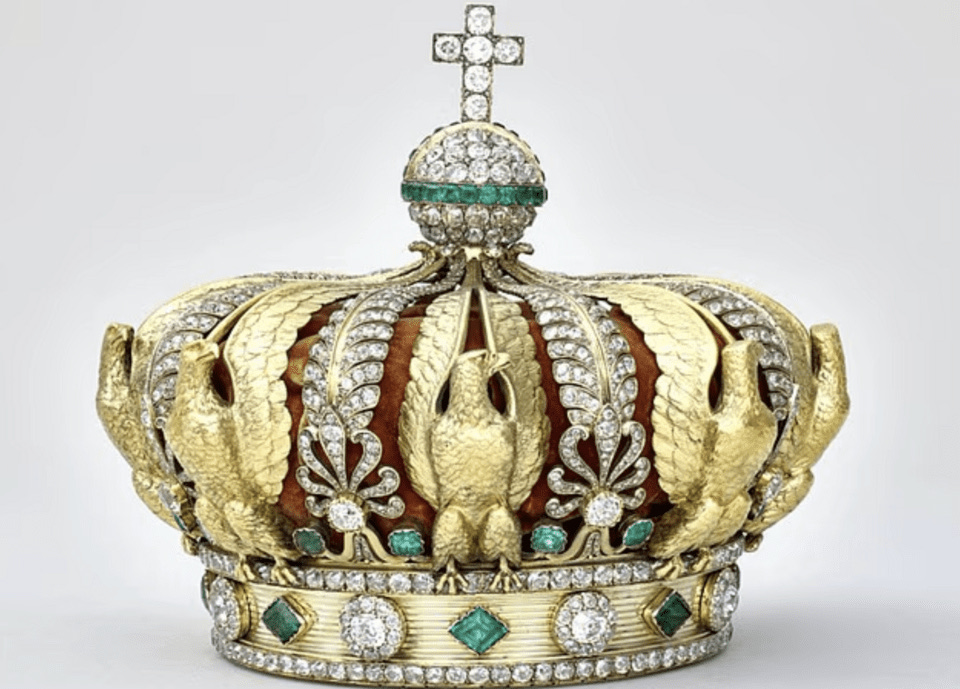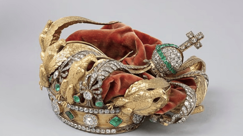 «Το στέμμα αρχικά διέθετε οκτώ ανθέμια από διαμάντια και σμαράγδια, εναλλάξ με οκτώ χρυσούς αετούς. Σήμερα, λείπει μόνο ένας από τους αετούς. Όλα τα ανθέμια υπάρχουν, αν και τέσσερα έχουν αποκολληθεί και μερικά από αυτά έχουν παραμορφωθεί.