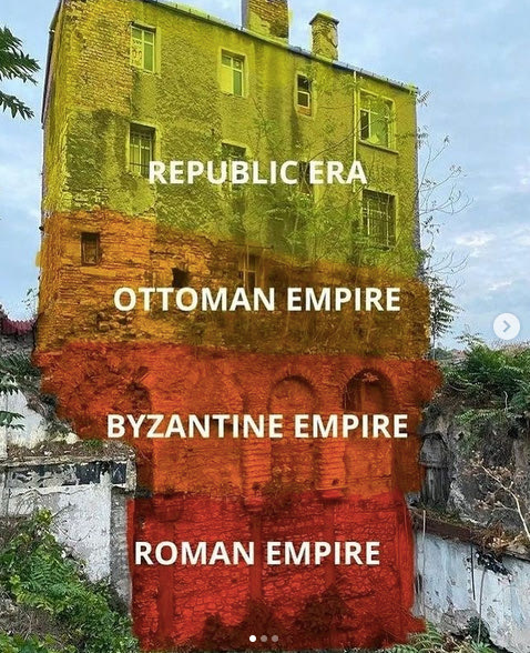 Ένα εκπληκτικό παράδειγμα της αρχιτεκτονικής στον χρόνο είναι το κτήριο κοντά στο τζαμί Φατίχ της Κωνσταντινούπολης . Ένα εξαιρετικό παράδειγμα διαστρωμάτωσης αρχιτεκτονικού στυλ κατά τη διάρκεια των αιώνων. Ενσωματώνει στοιχεία από τρεις αυτοκρατορίες -τη Ρωμαϊκή, τη Βυζαντινή, την Οθωμανική και τη σύγχρονη εποχή που αυτές κυβέρνησαν την πόλη σε διαφορετικές χρονικές περιόδους. Κάθε στρώμα βασίζεται στα προηγούμενα!