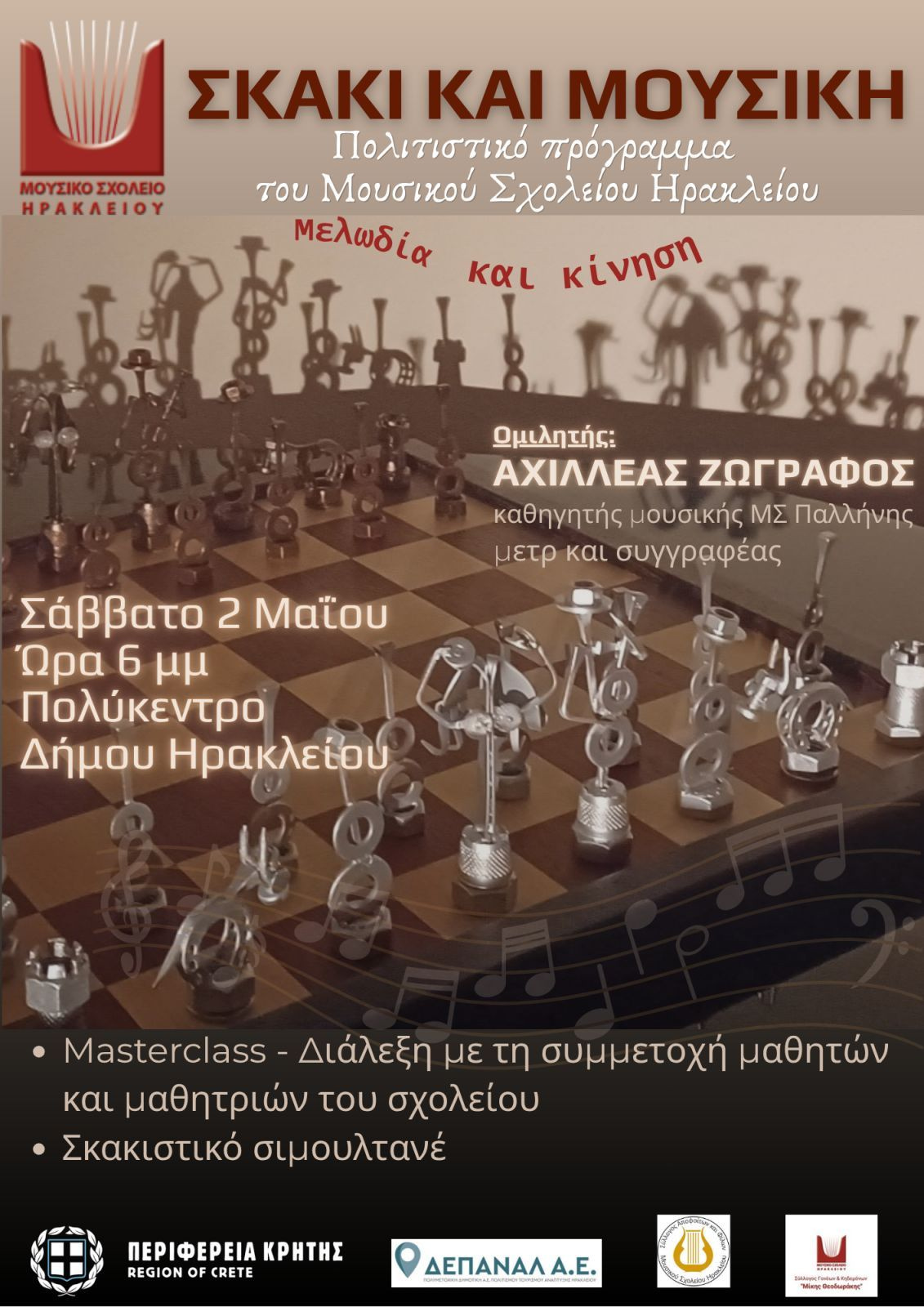 Το Μουσικό Σχολείο Ηρακλείου, ο Σύλλογος Γονέων και Κηδεμόνων και ο Σύλλογος Αποφοίτων και Φίλων, σας προσκαλούν στην εκδήλωση με τίτλο “Σκάκι και Μουσική” που θα πραγματοποιηθεί στο Πολύκεντρο του Δήμου Ηρακλείου το Σάββατο 02 Μαίου 2026 και ώρα 6μμ. Η εκδήλωση διερευνά τις κοινές αρχές ανάμεσα στα μουσική και το σκάκι, με τη μορφή masterclass – διάλεξης εμπλουτισμένης με επιλεγμένα μουσικά κομμάτια για κιθάρα και πιάνο, που θα εκτελούν ζωντανά μαθητές και μαθήτριες του Μουσικού Σχολείου Ηρακλείου. Αποτελεί παρουσίαση του εγκεκριμένου από τη ΔευτεροΒάθμια Διεύθυνση Εκπαίδευσης Ν. Ηρακλείου Πολιτιστικού Προγράμματος του Μουσικού Σχολείου Ηρακλείου, με τίτλο: “Συνθέσεις για πιάνο και σκακιστική δημιουργία” (υπεύθυνοι καθηγητές: Ασπασία Καραλή, Ασπαλένα Κωτούζα, Ευαγγελία Στρατάκη, Iσμήνη Νίσκου, Ευάγγελος Πάνου, Τρύφωνας Θωμόπουλος). Τη διάλεξη θα παρουσιάσει ο Αχιλλέας Ζωγράφος, καθηγητής πιάνου του Μουσικού Σχολείου Παλλήνης και διακεκριμένος μετρ σκακιού, συγγραφέας του βιβλίου “Music and Chess: Apollo meets Caissa”, που κυκλοφορεί από τις εκδόσεις Russell Enterprises. Μέσα από επιλεγμένα μουσικά έργα, σκακιστικά προβλήματα και παρτίδες, αναδεικνύεται ότι τα δύο πεδία μοιράζονται παρόμοιες δομές σκέψης, μορφές οργάνωσης και αισθητικά κριτήρια. Η παρουσίαση έχει βιωματικό χαρακτήρα, συνδυάζοντας ακρόαση, ανάλυση, παραδείγματα στη σκακιέρα και εκτέλεση μουσικών αποσπασμάτων. Η εκδήλωση θα κλείσει με παρτίδα σκακιού σιμουλτανέ μεταξύ των μαθητών και του κ. Αχ. Ζωγράφου.
