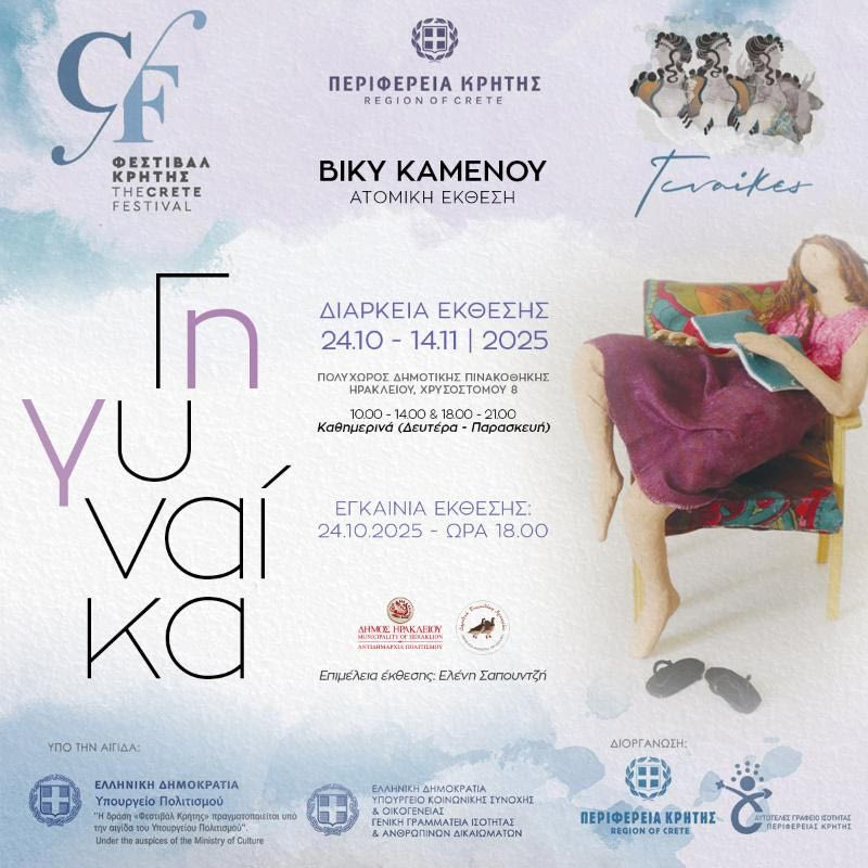 «Γη-Γυναίκα», είναι ο τίτλος της ατομικής έκθεσης της Βίκυς Καμένου, που θα παρουσιαστεί στη Δημοτική Πινακοθήκη Ηρακλείου στην οδό Χρυσοστόμου 8 από τις 24/10/202 έως τις 14/11/2025 στο πλαίσιο της παράλληλης δράσης του 5ου Φεστιβάλ Κρήτης «Γυναίκες», που υλοποιείται για 2η συνεχόμενη χρονιά, με την υποστήριξη του Αυτοτελούς Γραφείου Ισότητας της Περιφέρειας Κρήτης. Την επιμέλεια της έκθεσης υπογράφει η ιστορικός τέχνης Ελένη Σαπουντζή. Τα επίσημα εγκαίνια θα πραγματοποιηθούν την Παρασκευή 24 Οκτωβρίου 2025 και ώρα 18.00.