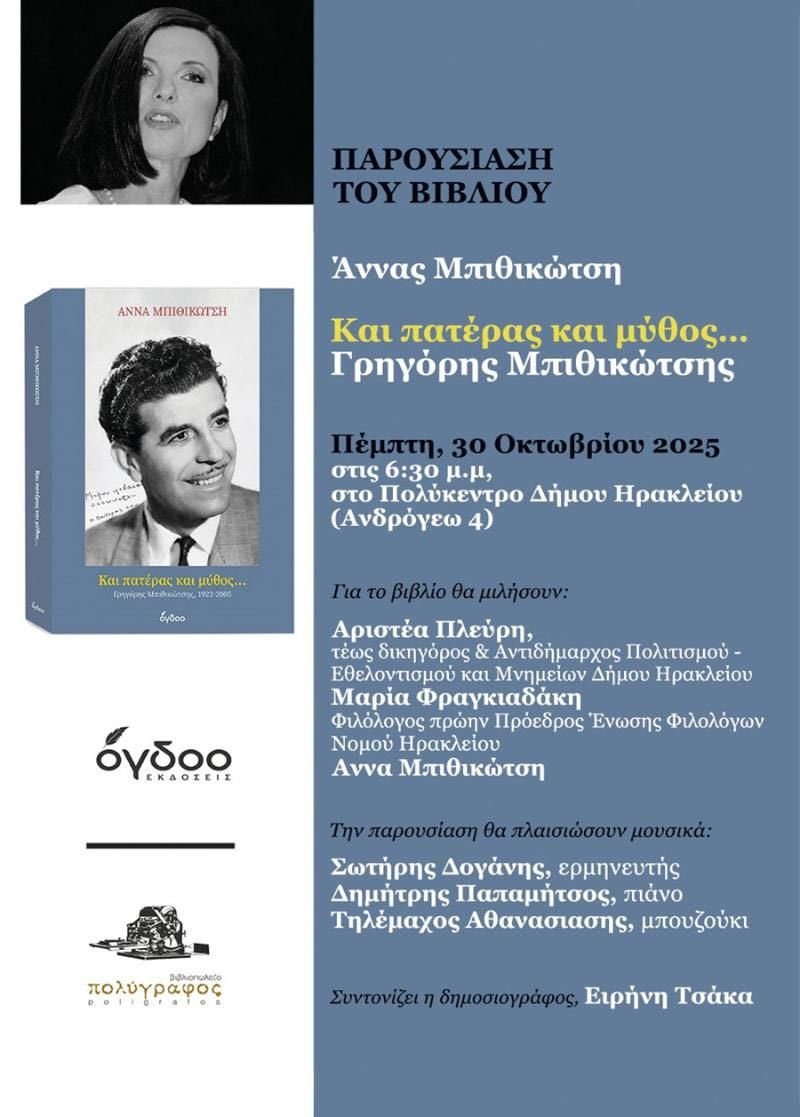 Οι εκδόσεις Όγδοο, η συγγραφέας Άννα Μπιθικώτση, και το βιβλιοπωλείο «Πολύγραφος» σας προσκαλούν στην παρουσίαση του βιβλίου «Και Πατέρας και Μύθος – Γρηγόρης Μπιθικώτσης 1922- 2005» .Για το βιβλίο θα μιλήσουν: Αριστέα Πλεύρη (τέως δικηγόρος και Αντιδήμαρχος Πολιτισμού – Εθελοντισμού και Μνημείων Δήμου Ηρακλείου), Μαρία Φραγκιαδάκη (Φιλόλογος, πρώην Πρόεδρος Ένωσης