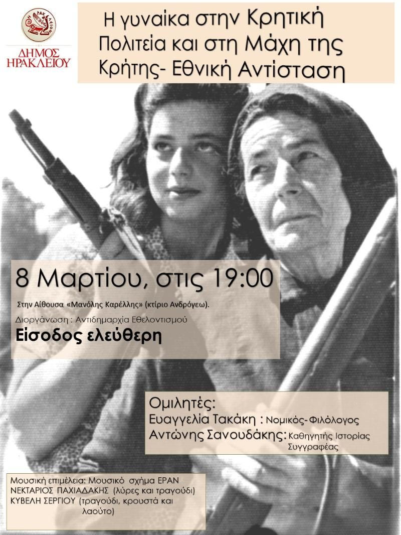 Μια ιδιαίτερη εκδήλωση για τη γυναίκα στα χρόνια της Κρητικής Πολιτείας, της Μάχης της Κρήτης και της Εθνικής Αντίστασης διοργανώνει, με αφορμή την Παγκόσμια Ημέρα της Γυναίκας, ο Δήμος Ηρακλείου και η Αντιδημαρχία Εθελοντισμού.