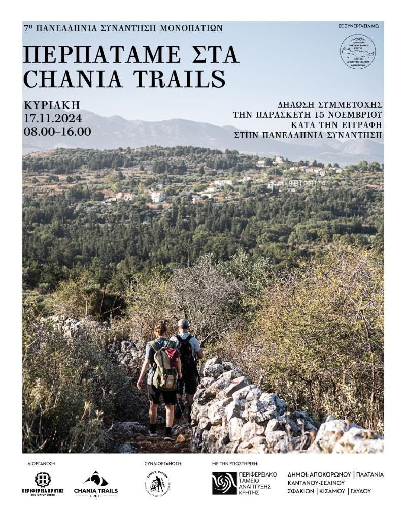 Το τριήμερο πρόγραμμα πλαισιώνεται με προβολή ταινίας, συναυλία με τις μουσικές των μονοπατιών της Κρήτης, γνωριμία με το νέο Αρχαιολογικό Μουσείο Χανίων και την Αρχαία Απτέρα καθώς και με εξόρμηση στα μονοπάτια των Chania Trails στον Αποκόρωνα, τον Πλατανιά και το Σέλινο.