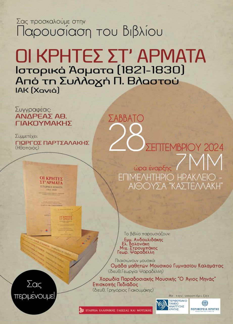 Η Εταιρία Ελληνικής Γλώσσας και Μουσικής με την υποστήριξη της Περιφέρειας Κρήτης παρουσιάζει το βιβλίο του Ανδρέα Αθ. Γιακουμάκη, «Οι Κρήτες στ’ Άρματα. Ιστορικά Άσματα (1821-1830). Από τη Συλλογή Π. Βλαστού ΙΑΚ Χανιά», το Σάββατο 28 Σεπτεμβρίου στις 19.00 στο Επιμελητήριο Ηρακλείου (αίθουσα Καστελλάκη) με ελεύθερη είσοδο.