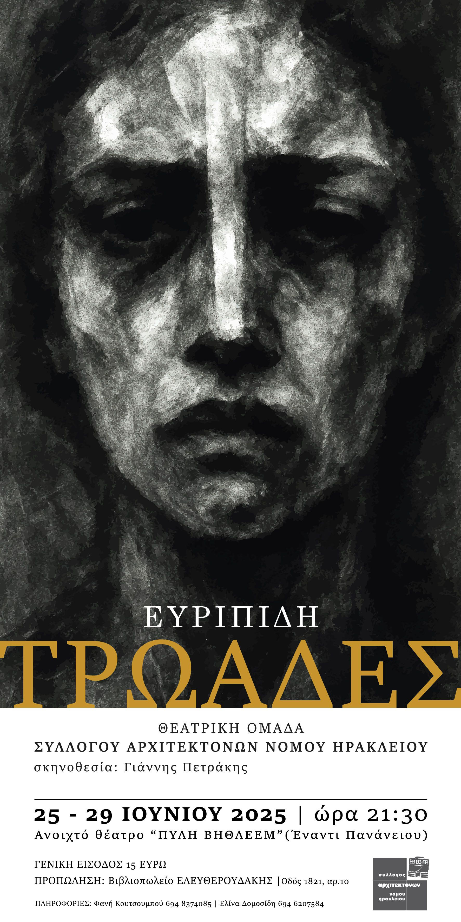 Η Θεατρική Ομάδα του Συλλόγου Αρχιτεκτόνων Νομού Ηρακλείου παρουσιάζει την Τραγωδία του Ευρυπίδη “Τρωάδες” σε σκηνοθεσία Γιάννη Πετράκη, από 25-29 Ιουνίου, στο ανοιχτό θέατρο “Πύλη Βηθλεέμ” (Έναντι Πανάνειου).