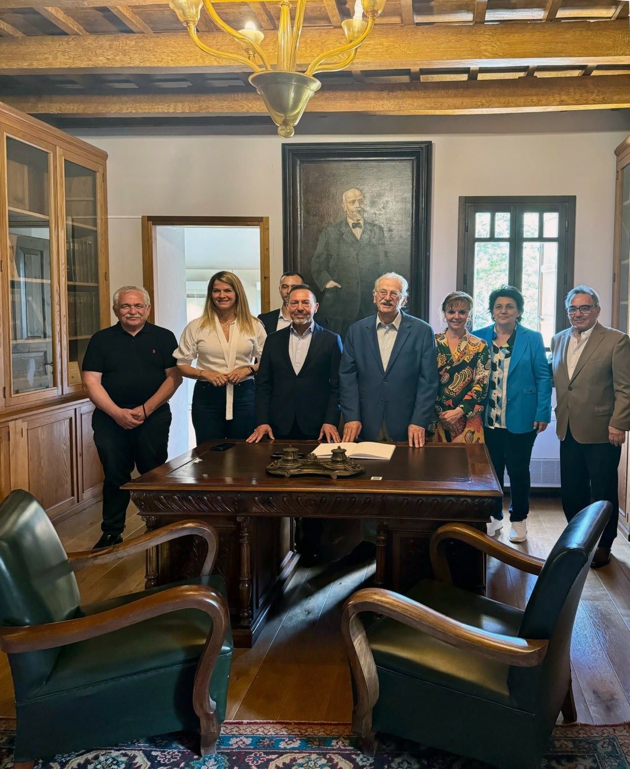 Τον διοικητή της ΤτΕ και τη συνοδεία του ξενάγησαν στο Μουσείο ο γενικός διευθυντής του Εθνικού Ιδρύματος «Ελευθέριος Κ. Βενιζέλος» Νικόλαος Παπαδάκης-Παπαδής, η αναπληρώτρια διευθύντρια Αργυρώ Βατσάκη και ο ιστορικός Σπύρος Νταουντάκης, ενώ είχαν την ευκαιρία να χρησιμοποιήσουν τις καινοτόμες εφαρμογές επαυξημένης (AR) και εικονικής πραγματικότητας (VR) και να ενημερωθούν για το έργο του Ιδρύματος και τον προγραμματισμό των δράσεών του.