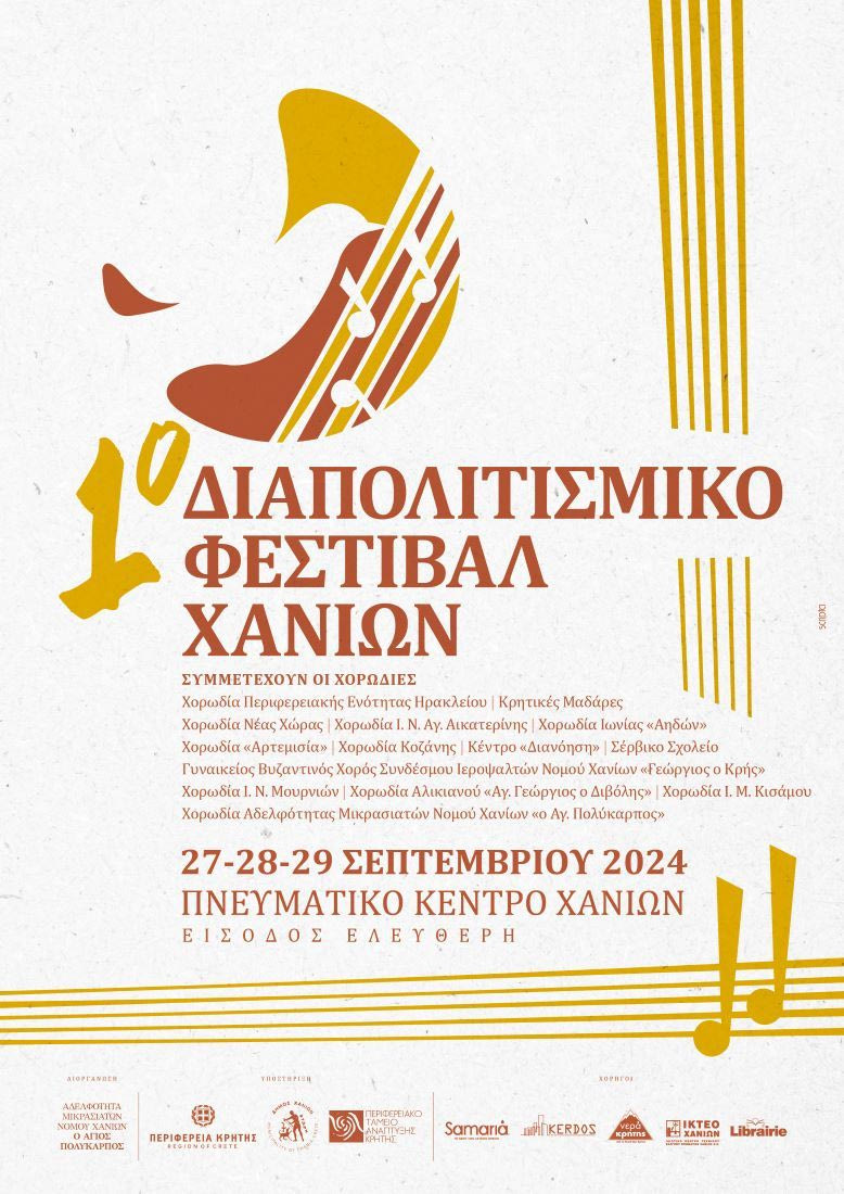 H Αδελφότητα Μικρασιατών Ν. Χανίων “Ο Άγιος Πολύκαρπος” σε συνδιοργάνωση με την Περιφέρεια Κρήτης, Περιφερειακό Ταμείο Ανάπτυξης Κρήτης, Περιφερειακή Ενότητα Χανίων και τον Δήμο Χανίων, διοργανώνει το 1ο Διαπολιτισμικό Φεστιβάλ Χορωδιών Χανίων (μετέχουν 13 χορωδίες) στις 27,28,29 Σεπτεμβρίου στο Πνευματικό Κέντρο Χανίων.