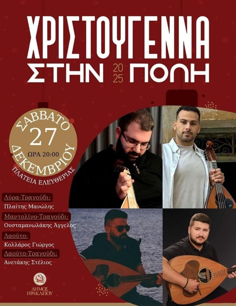 Συνεχίζεται το εμπλουτισμένο πρόγραμμα «Χριστούγεννα στην Πόλη 2025» για μικρούς και μεγάλους, όλες με ελεύθερη είσοδο έπειτα και από την χρηματοδότηση ύψους 150.000 ευρώ του Υπουργείου Πολιτισμού προς τον Δήμο Ηρακλείου, στο πλαίσιο της Προγραμματικής Σύμβασης Πολιτισμικής Ανάπτυξης (ΠΣΠΑ) των Ενετικών Τειχών.