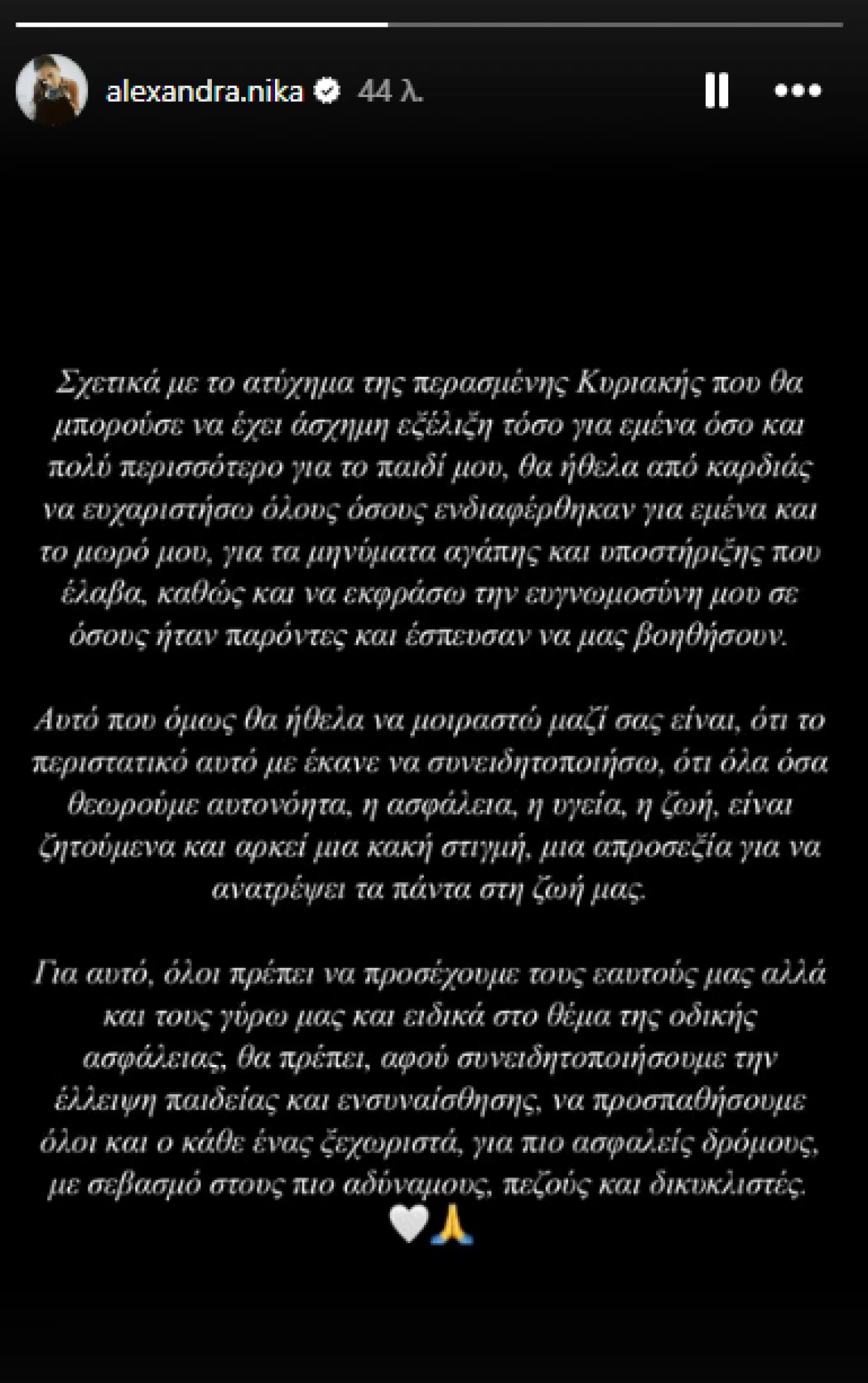 Στη συνέχεια, η Αλεξάνδρα Νίκα πρόσθεσε: «Αυτό που όμως θα ήθελα να μοιραστώ μαζί σας είναι, ότι το περιστατικό αυτό με έκανε να συνειδητοποιήσω, ότι όλα όσα θεωρούμε αυτονόητα, η ασφάλεια, η υγεία, η ζωή, είναι ζητούμενα και αρκεί μια κακή στιγμή, μια απροσεξία για να ανατρέψει τα πάντα στη ζωή μας».