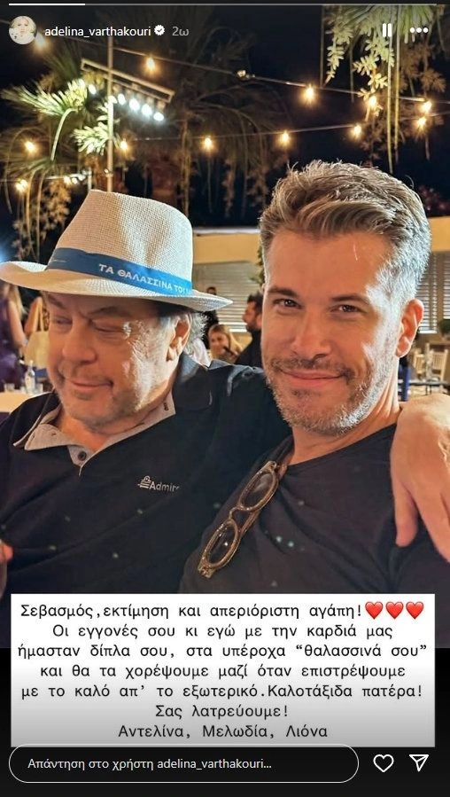«Σεβασμός, εκτίμηση και απεριόριστη αγάπη. Οι εγγονές σου, κι εγώ με την καρδιά μας, ήμασταν δίπλα σου, στα υπέροχα “θαλασσινά σου” και θα τα χορέψουμε μαζί όταν επιστρέψουμε με το καλό απ’ το εξωτερικό. Καλοτάξιδα πατέρα! Σας λατρεύουμε. Αντελίνα, Μελωδία, Λιόνα», έγραψε η Αντελίνα Βαρθακούρη.