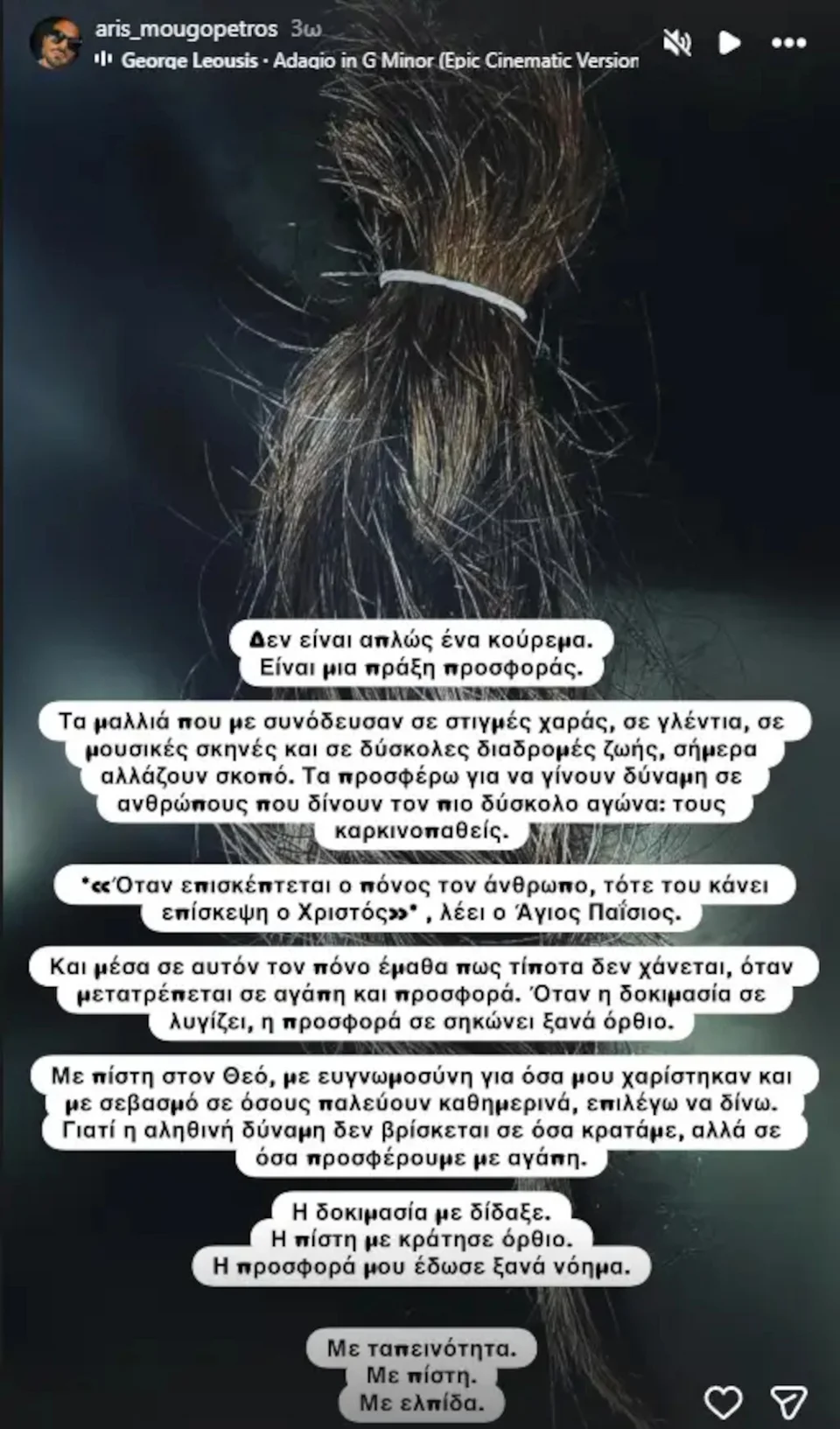 Οπως σημείωσε ο μουσικός «Τα μαλλιά που με συνόδευσαν σε στιγμές χαράς, σε γλέντια, σε μουσικές σκηνές και σε δύσκολες διαδρομές ζωής, σήμερα αλλάζουν σκοπό. Τα προσφέρω για να γίνουν δύναμη σε ανθρώπους που δίνουν τον πιο δύσκολο αγώνα: τους καρκινοπαθείς.
