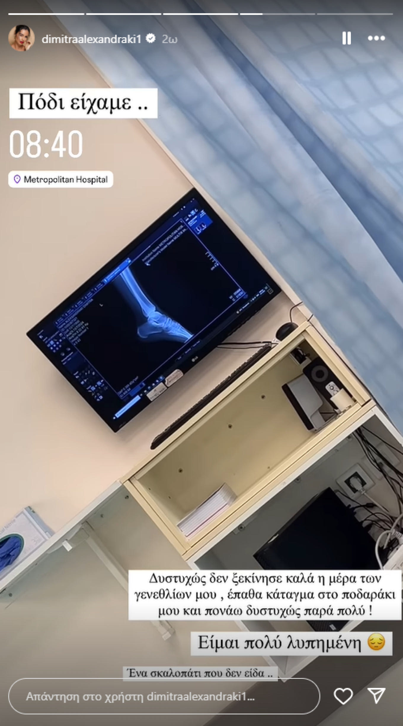 Σε story που δημοσίευσε η Δήμητρα Αλεξανδράκη έδειξε στους ακόλουθούς της πού βρίσκεται και έγραψε: «Δυστυχώς, δεν ξεκίνησε καλά η μέρα των γενεθλίων μου».