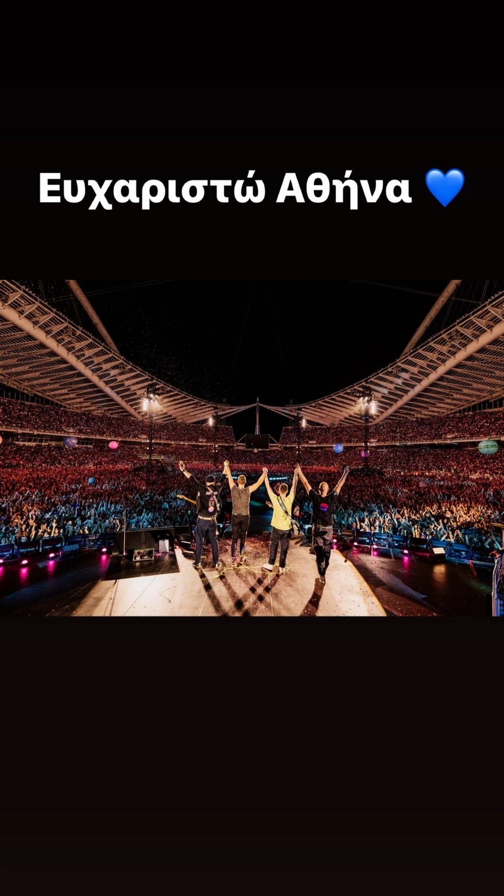 Μετά το τέλος της συναυλίας, οι Coldplay ευχαρίστησαν τους θαυμαστές τους, ανεβάζοντας στον προσωπικό τους λογαριασμό στο Instagram ένα μήνυμα στα ελληνικά.