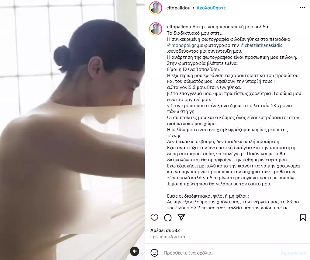 Με αφορμή μια πρόσφατη φωτογράφισή της, η γνωστή χορεύτρια και ηθοποιός, θέλησε να μοιραστεί με τους διαδικτυακούς της φίλους μια τόπλες φωτογραφία της, στην οποία τη βλέπουμε να φοράει μόνο ένα διάφανο μπλουζάκι. Η Έλενα Τοπαλίδου, συνόδευσε την ανάρτησή της με ένα ιδιαίτερο μήνυμα, μέσα από το οποίο μοιράστηκε κάποιες σκέψεις της με τους διαδικτυακούς της φίλους και έδωσε και κάποιες λεπτομέρειες για εκείνη σε όσους δεν την γνωρίζουν.
