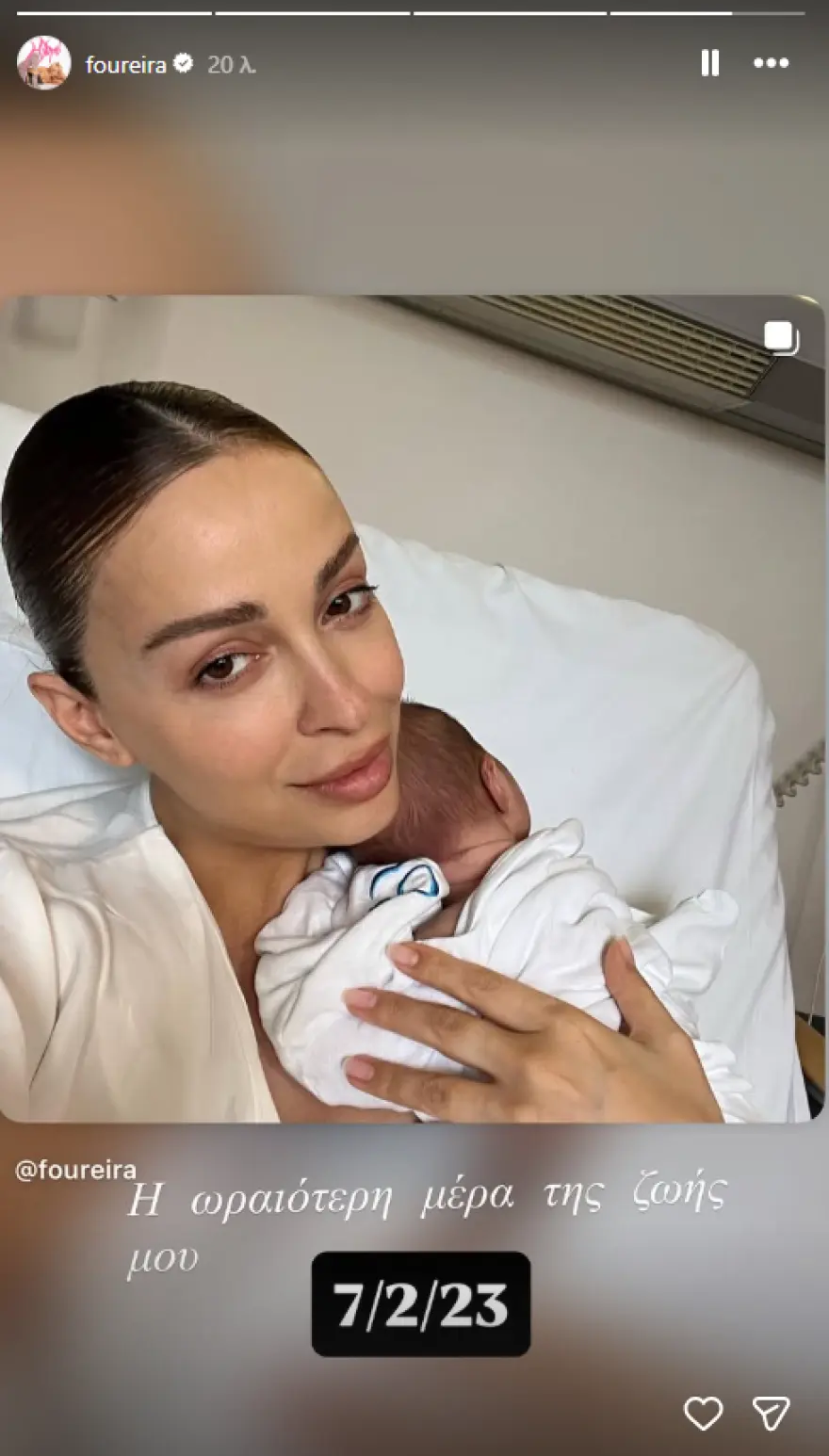 Πιο αναλυτικά, η Ελένη Φουρέρια αναδημοσίευσε μέσω Instagram strories, την ανάρτηση που είχε κάνει από το μαιευτήριο με το παιδί της, σημειώνοντας: «7/2/23. Η ωραιότερη ημέρα της ζωής μου».