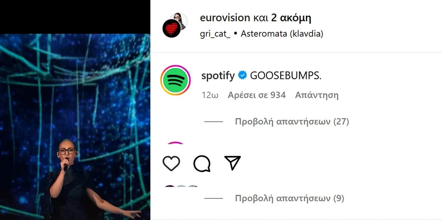 Ο επίσημος λογαριασμός του Spotify στο Instagram σχολίασε με τη λέξη «goosebumps» κάτω από το βίντεο της πρόβας της Κλαυδίας για τη Eurovision, προκαλώντας αίσθηση στους χρήστες. Η αγγλική λέξη «goosebumps» μεταφράζεται στα ελληνικά ως «ανατριχίλα» και χρησιμοποιείται για να περιγράψει μια έντονη συναισθηματική αντίδραση, συνήθως συγκίνηση ή δέος. Το σχόλιο αυτό, προερχόμενο από έναν από τους μεγαλύτερους μουσικούς οργανισμούς παγκοσμίως, αποτελεί ένδειξη ότι η ερμηνεία της Κλαυδίας άγγιξε το διεθνές κοινό και ξεχώρισε ήδη από την πρόβα.