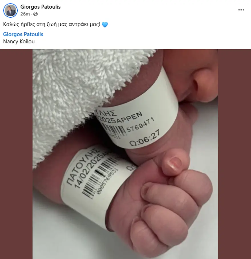 Σε πελάγη ευτυχίας πλέουν ο Γιώργος Πατούλης και η Νάνσυ Κοιλού καθώς σήμερα το πρωί υποδέχθηκαν το πρώτο τους παιδί, τον γιο τους.