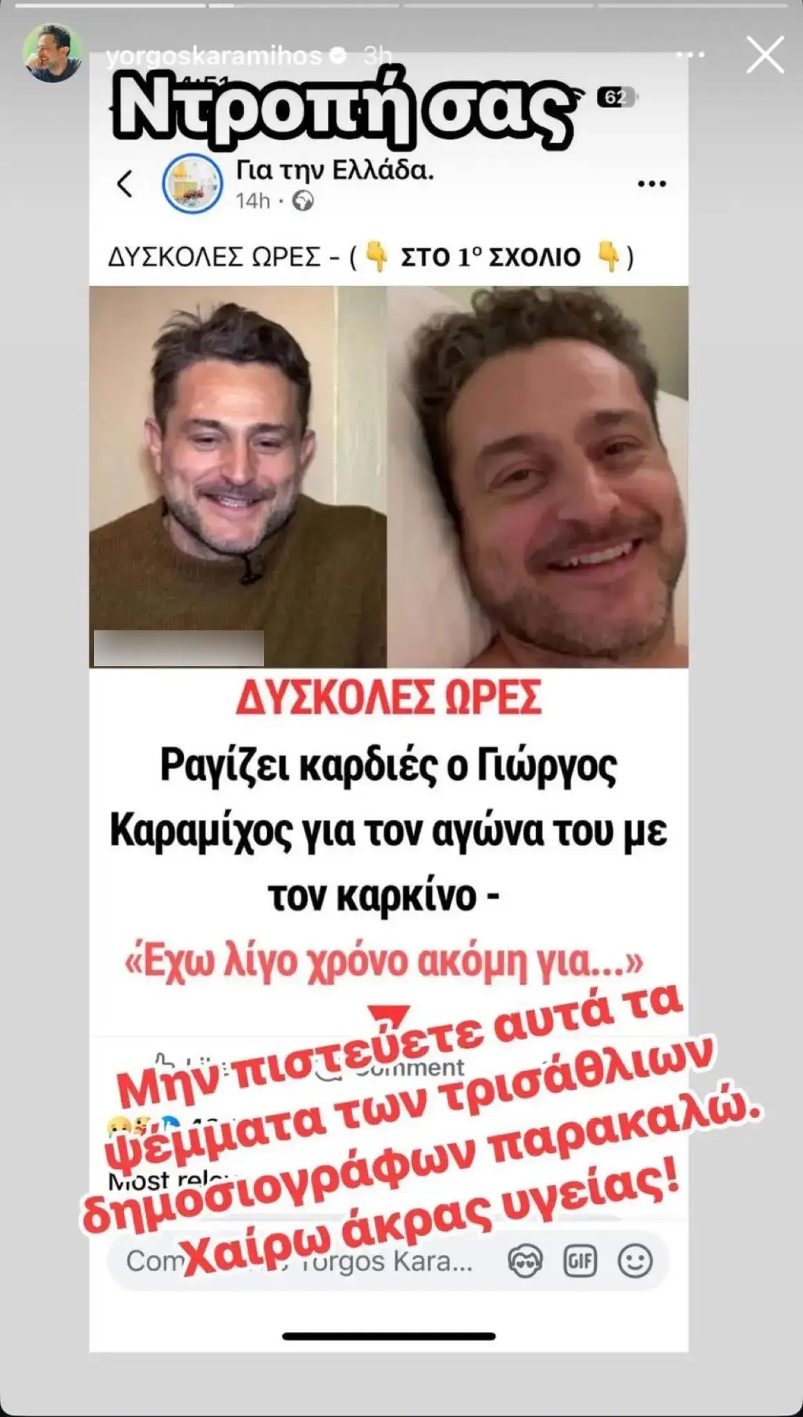 Με ανάρτηση στον προσωπικό του λογαριασμό στο Instagram, ο Γιώργος Καραμίχος δεν μάσησε τα λόγια του: «Ντροπή σας. Μην πιστεύετε αυτά τα ψέματα των τρισάθλιων δημοσιογράφων. Χαίρω άκρας υγείας» έγραψε.