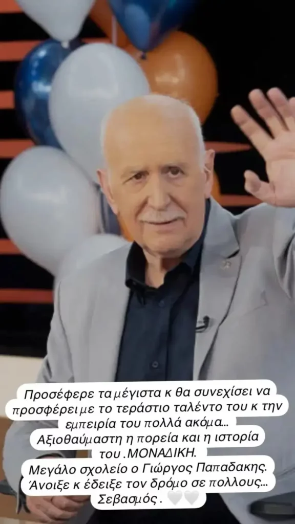 «Προσέφερε τα μέγιστα και θα συνεχίσει να προσφέρει με το τεράστιο ταλέντο του και την εμπειρία του πολλά ακόμα… Αξιοθαύμαστη η πορεία και η ιστορία του. ΜΟΝΑΔΙΚΗ. Μεγάλο σχολείο ο Γιώργος Παπαδάκης. Άνοιξε κ έδειξε τον δρόμο σε πολλούς… Σεβασμός» έγραψε σε story της.
