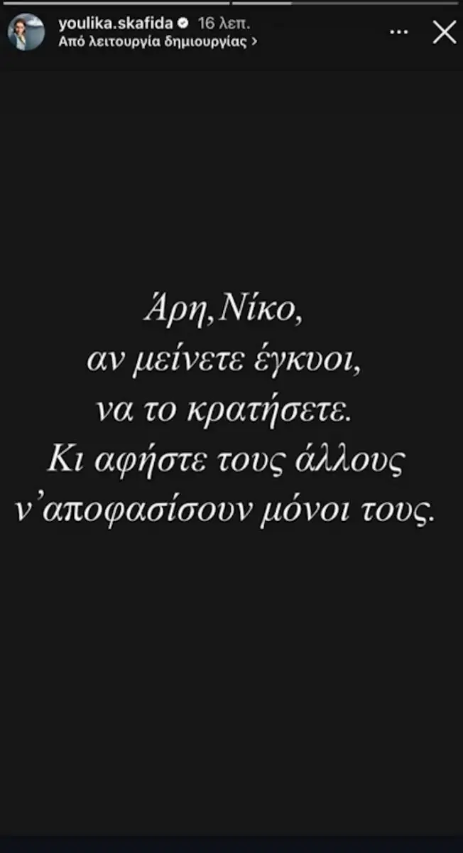 «Άρη, Νίκο, αν μείνετε έγκυοι, να το κρατήσετε. Κι αφήστε τους άλλους να αποφασίζουν μόνοι τους» έγραψε η Γιούλικα Σκαφιδά, λίγες ώρες μετά την δήλωση του Άρη Σερβετάλη για τις αμβλώσεις.