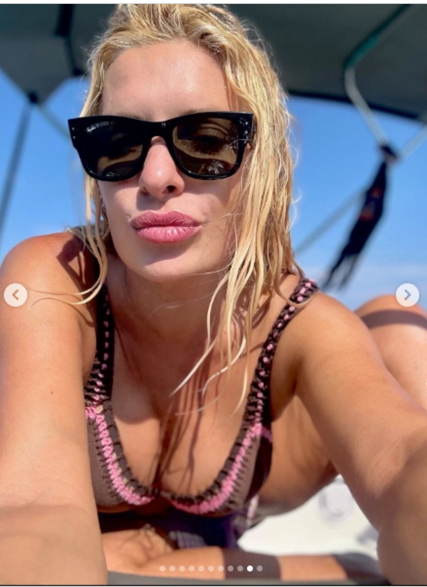 Σε στιγμιότυπα που ανάρτησε φαίνεται να ποζάρει με το μαγιό της στη θάλασσα και σε σκάφος. Σε άλλες εικόνες αποτύπωσε τον σύζυγό της να χαλαρώνει, ενώ δεν παρέλειψε να δείξει και γεύμα που απόλαυσε στους Παξούς.