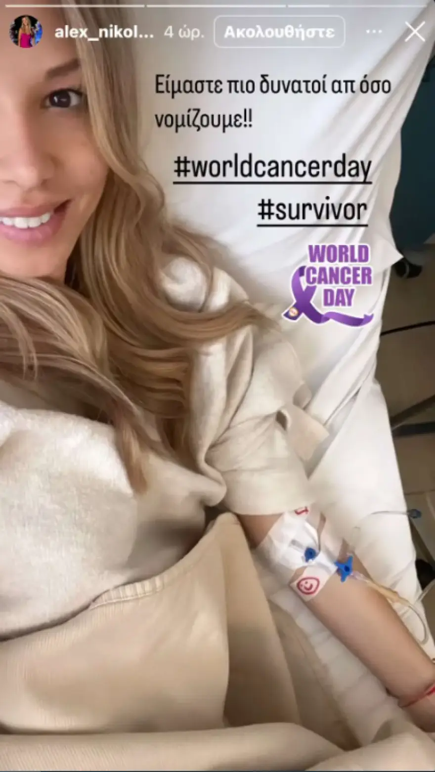 Η Aλεξάνδρα Νικολαΐδου, η σύντροφος του Ντέμη Νικολαΐδη με αφορμή την Παγκόσμια Ημέρα κατά του Καρκίνου δημοσίευσε μία φωτογραφία της μέσα από το νοσοκομείο, αποκαλύπτοντας για πρώτη φορά τη μάχη που δίνει με τον καρκίνο.