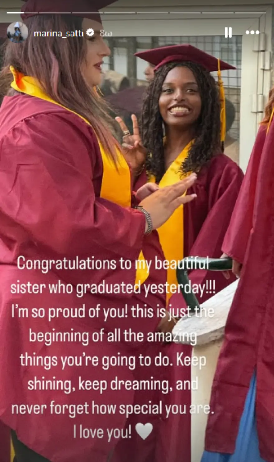 «Συγχαρητήρια στην όμορφη αδελφή μου που αποφοίτησε χθες! Είμαι τόσο περήφανη για σένα! Αυτό είναι μόνο η αρχή από όλα τα υπέροχα πράγματα που πρόκειται να κάνεις. Συνέχισε να λάμπεις, να ονειρεύεσαι και μην ξεχνάς ποτέ πόσο ξεχωριστή είσαι. Σ’ αγαπώ», έγραψε η Μαρίνα Σάττι σε μια από τις αναρτήσεις της στον προσωπικό της λογαριασμό στο Instagram.